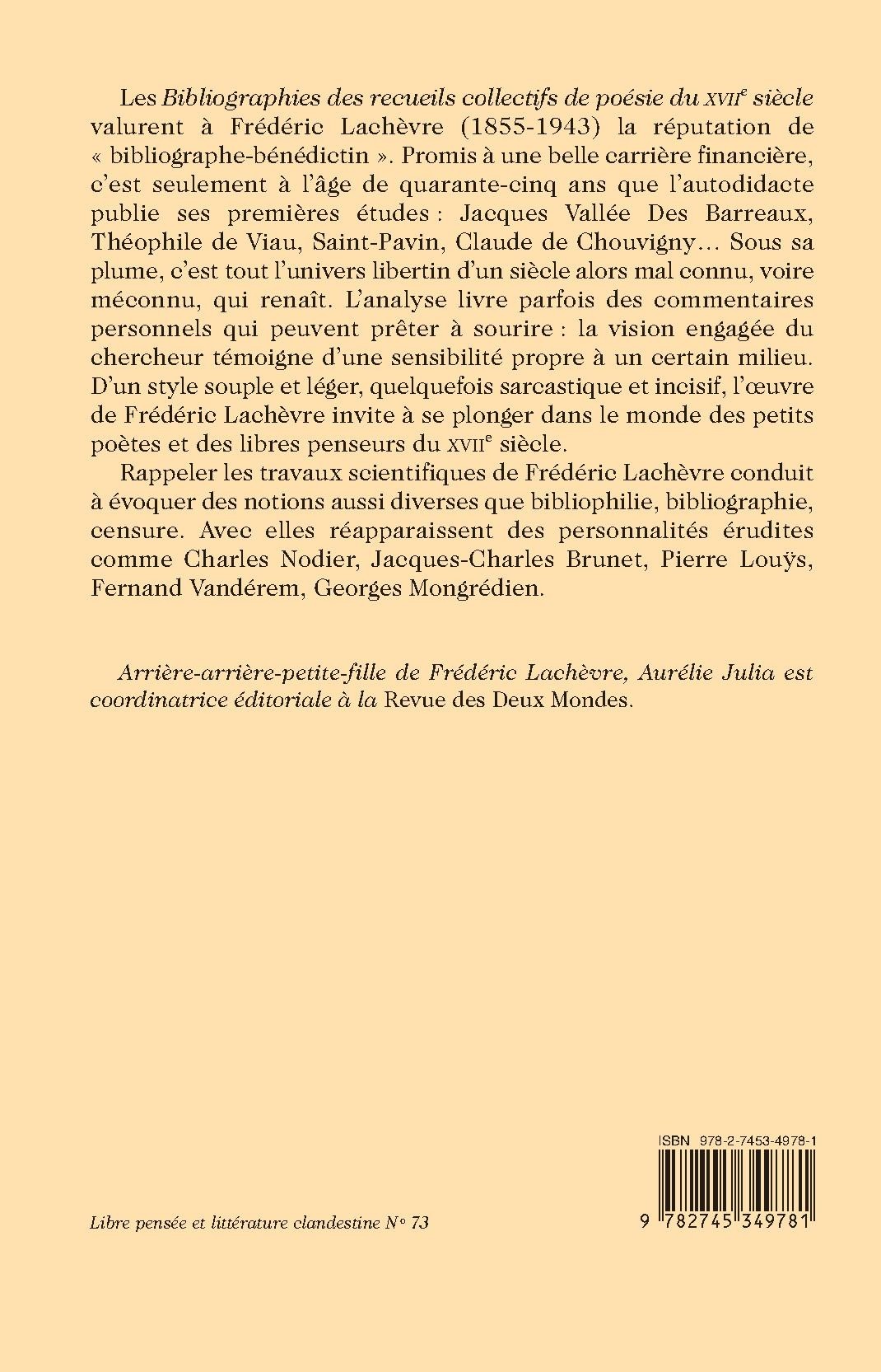 Les Bibliographies des recueils collectifs de poésie du XVIIe siècle valurent à Frédéric Lachèvre (1855-1943) la réputation de « bibliographe-bénédictin ». Promis à une belle carrière financière, c’est seulement à l’âge de quarante-cinq ans que l’autodidacte publie ses premières études : Jacques Vallée Des Barreaux, Théophile de Viau, Saint-Pavin, Claude de Chouvigny… Sous sa plume, c’est tout l’univers libertin d’un siècle alors mal connu, voire méconnu, qui renaît. L’analyse livre parfois des commentaires personnels qui peuvent prêter à sourire : la vision engagée du chercheur témoigne d’une sensibilité propre à un certain milieu. D’un style souple et léger, quelquefois sarcastique et incisif, l’oeuvre de Frédéric Lachèvre invite à se plonger dans le monde des petits poètes et des libres penseurs du XVIIe siècle.