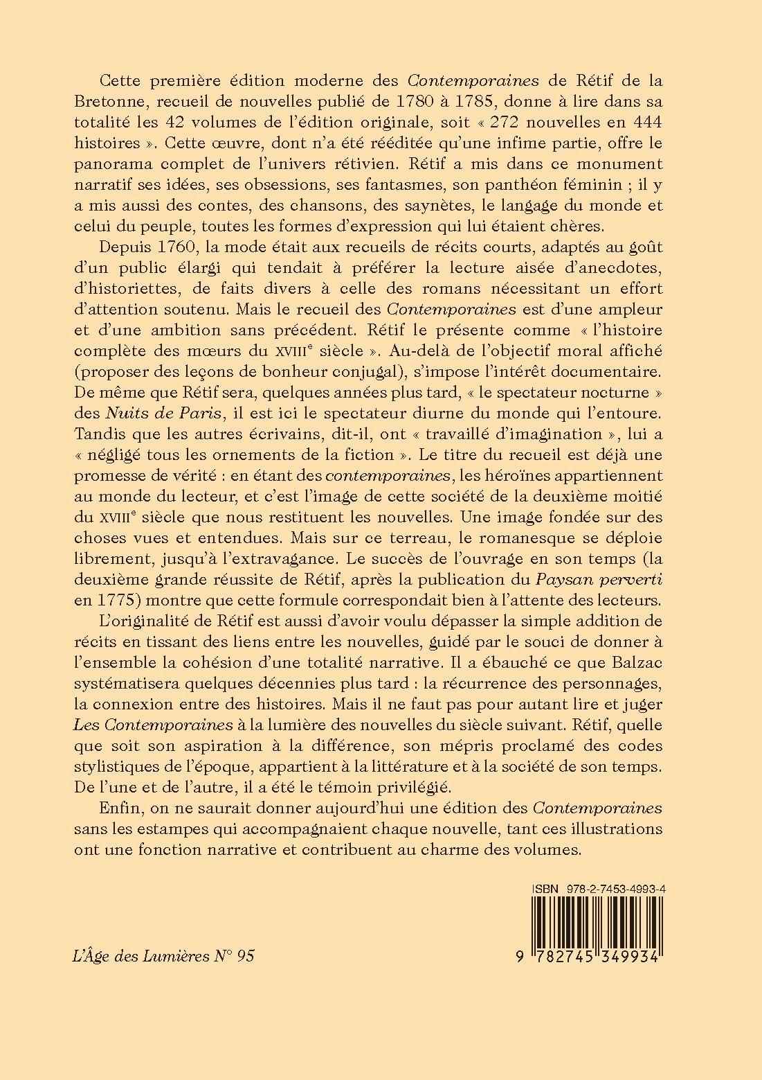 Cette première édition moderne des Contemporaines de Rétif de la Bretonne, recueil de nouvelles publié de 1780 à 1785, donne à lire dans sa totalité les 42 volumes de l’édition originale, soit « 272 nouvelles en 444 histoires ». Cette oeuvre, dont n’a été rééditée qu’une infime partie, offre le panorama complet de l’univers rétivien. Rétif a mis dans ce monument narratif ses idées, ses obsessions, ses fantasmes, son panthéon féminin ; il y a mis aussi des contes, des chansons, des saynètes, le langage du monde et celui du peuple, toutes les formes d’expression qui lui étaient chères.