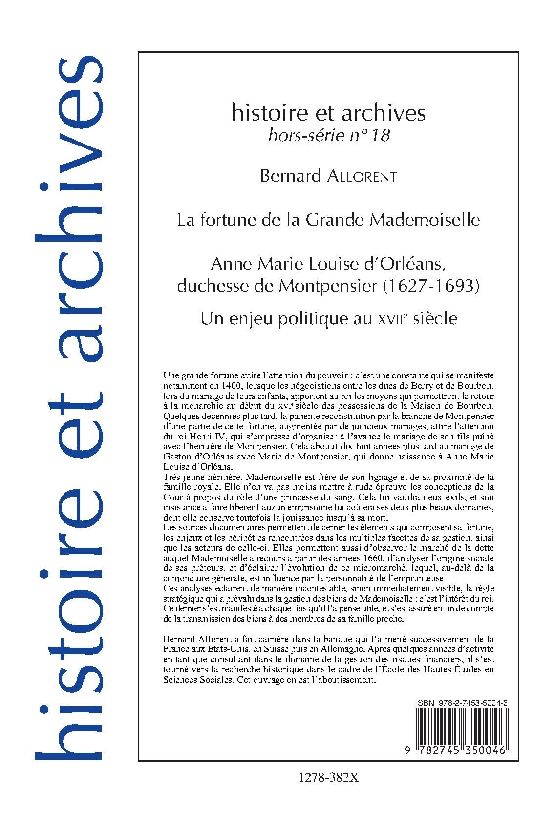 Les sources documentaires permettent de cerner les éléments qui composent sa fortune, les enjeux et les péripéties rencontrées dans les multiples facettes de sa gestion, ainsi que les acteurs de celle-ci. Elles permettent aussi d’observer le marché de la dette auquel Mademoiselle a recours à partir des années 1660, d’analyser l’origine sociale de ses prêteurs, et d’éclairer l’évolution de ce micromarché, lequel, au-delà de la conjoncture générale, est influencé par la personnalité de l’emprunteuse. Ces analyses éclairent de manière incontestable, sinon immédiatement visible, la règle stratégique qui a prévalu dans la gestion des biens de Mademoiselle : c’est l’intérêt du roi. Ce dernier s’est manifesté à chaque fois qu’il l’a pensé utile, et s’est assuré en fin de compte de la transmission des biens à des membres de sa famille proche.