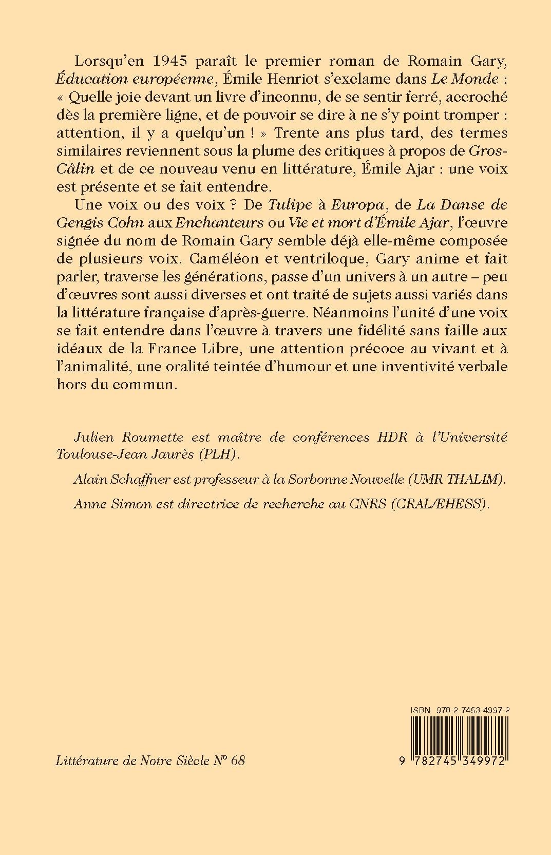 Une voix ou des voix ? De Tulipe à Europa, de La Danse de Gengis Cohn aux Enchanteurs ou Vie et mort d’Émile Ajar, l’oeuvre signée du nom de Romain Gary semble déjà elle-même composée de plusieurs voix. Caméléon et ventriloque, Gary anime et fait parler, traverse les générations, passe d’un univers à un autre – peu d’œuvres sont aussi diverses et ont traité de sujets aussi variés dans la littérature française d’après-guerre. Néanmoins l’unité d’une voix se fait entendre dans l’oeuvre à travers une fidélité sans faille aux idéaux de la France Libre, une attention précoce au vivant et à l’animalité, une oralité teintée d’humour et une inventivité verbale hors du commun.