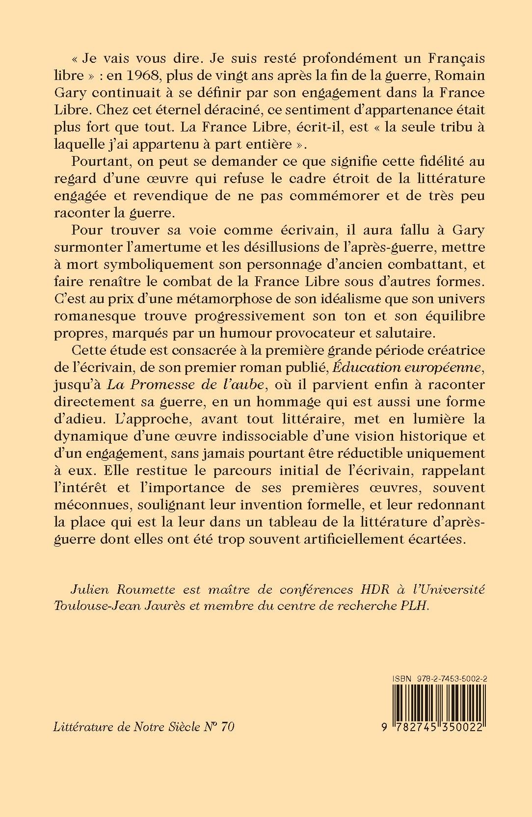 Cette étude est consacrée à la première grande période créatrice de l’écrivain, de son premier roman publié, Éducation européenne, jusqu’à La Promesse de l’aube, où il parvient enfin à raconter directement sa guerre, en un hommage qui est aussi une forme d’adieu. L’approche, avant tout littéraire, met en lumière la dynamique d’une oeuvre indissociable d’une vision historique et d’un engagement, sans jamais pourtant être réductible uniquement à eux. Elle restitue le parcours initial de l’écrivain, rappelant l’intérêt et l’importance de ses premières œuvres, souvent méconnues, soulignant leur invention formelle, et leur redonnant la place qui est la leur dans un tableau de la littérature d’après-guerre dont elles ont été trop souvent artificiellement écartées.