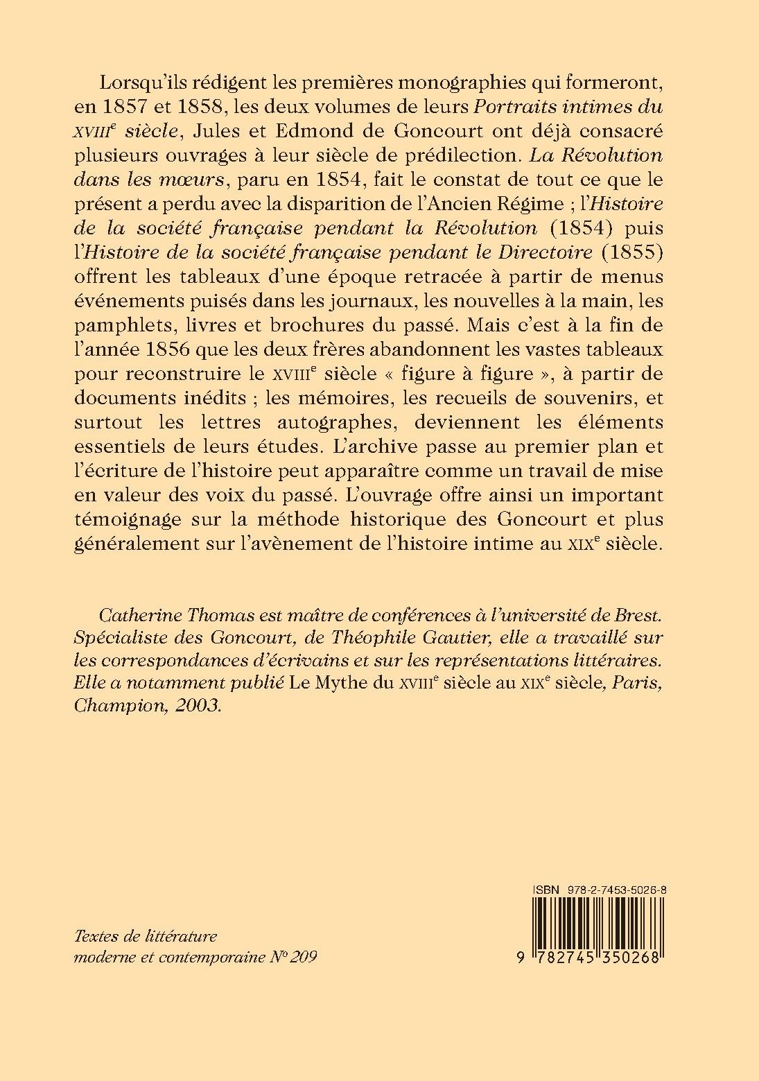Lorsqu’ils rédigent les premières monographies qui formeront, en 1857 et 1858, les deux volumes de leurs Portraits intimes du XVIIIe siècle, Jules et Edmond de Goncourt ont déjà consacré plusieurs ouvrages à leur siècle de prédilection. La Révolution dans les mœurs, paru en 1854, fait le constat de tout ce que le présent a perdu avec la disparition de l’Ancien Régime ; l’Histoire de la société française pendant la Révolution (1854) puis l’Histoire de la société française pendant le Directoire (1855) offrent les tableaux d’une époque retracée à partir de menus événements puisés dans les journaux, les nouvelles à la main, les pamphlets, livres et brochures du passé. Mais c’est à la fin de l’année 1856 que les deux frères abandonnent les vastes tableaux pour reconstruire le XVIIIe siècle « figure à figure », à partir de documents inédits ; les mémoires, les recueils de souvenirs, et surtout les lettres autographes, deviennent les éléments essentiels de leurs études. L’archive passe au premier plan et l’écriture de l’histoire peut apparaître comme un travail de mise en valeur des voix du passé. L’ouvrage offre ainsi un important témoignage sur la méthode historique des Goncourt et plus généralement sur l’avènement de l’histoire intime au XIXe siècle.