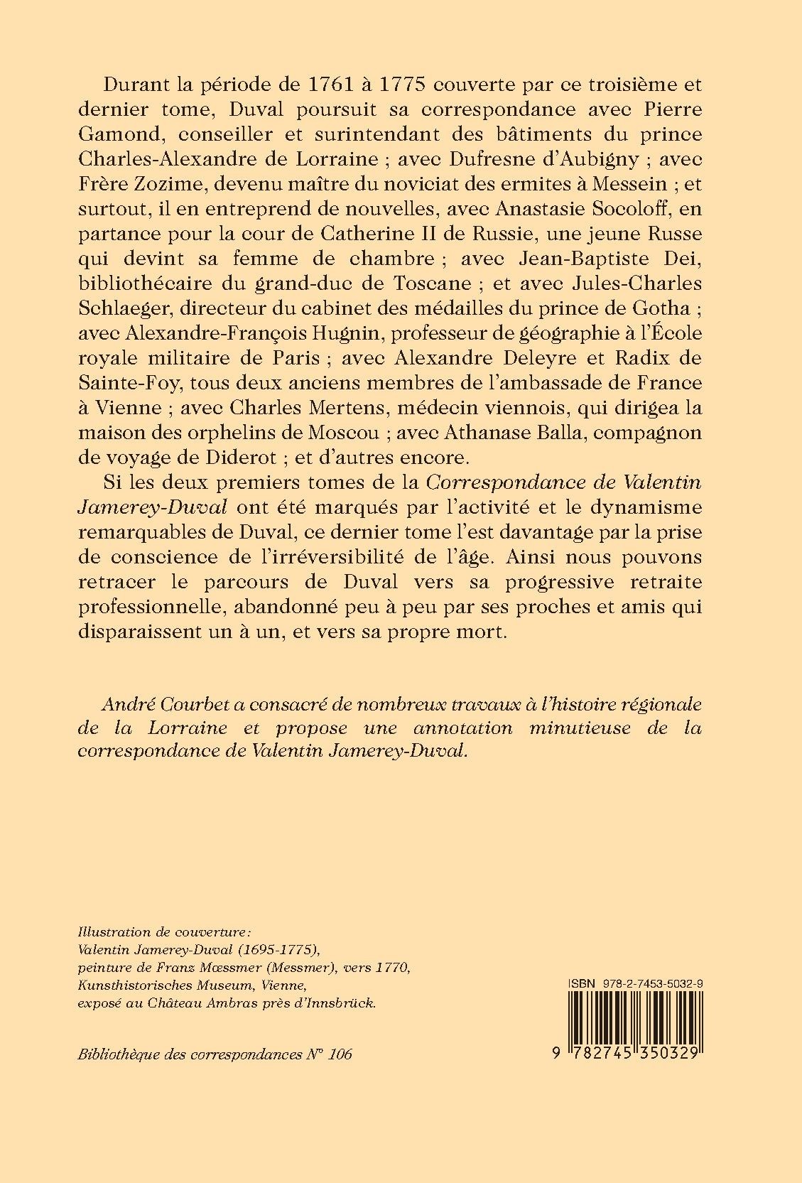 Durant la période de 1761 à 1775 couverte par ce troisième et dernier tome, Duval poursuit sa correspondance avec Pierre Gamond, conseiller et surintendant des bâtiments du prince Charles-Alexandre de Lorraine ; avec Dufresne d’Aubigny ; avec Frère Zozime, devenu maître du noviciat des ermites à Messein ; et surtout, il en entreprend de nouvelles, avec Anastasie Socoloff, en partance pour la cour de Catherine II de Russie, une jeune Russe qui devint sa femme de chambre ; avec Jean-Baptiste Dei, bibliothécaire du grand- duc de Toscane ; et avec Jules-Charles Schlaeger, directeur du cabinet des médailles du prince de Gotha ; avec Alexandre-François Hugnin, professeur de géographie à l’École royale militaire de Paris ; avec Alexandre Deleyre et Radix de Sainte-Foy, tous deux anciens membres de l’ambassade de France à Vienne ; avec Charles Mertens, médecin viennois, qui dirigea la maison des orphelins de Moscou ; avec Athanase Balla, compagnon de voyage de Diderot ; et d’autres encore.