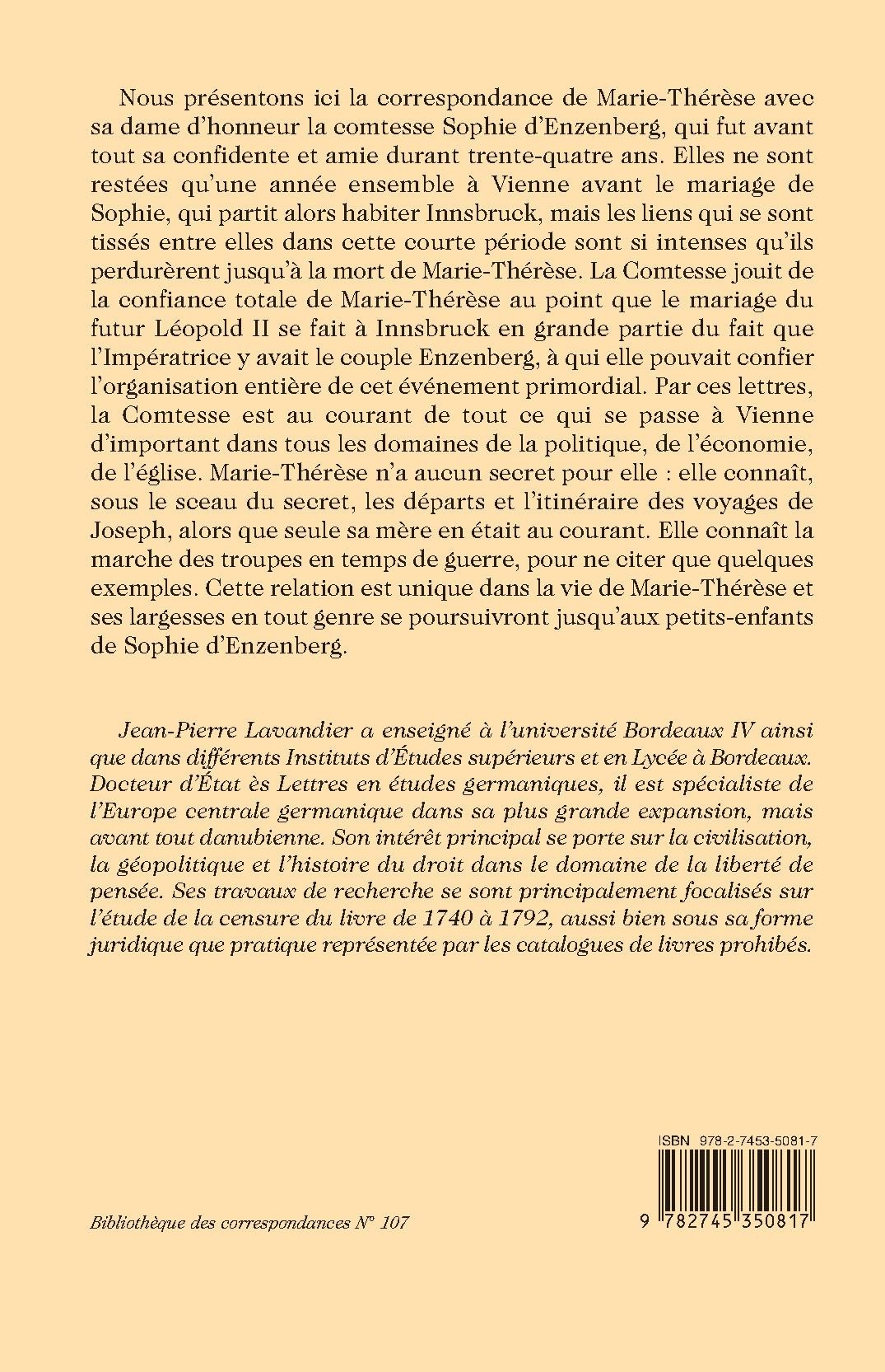 Nous présentons ici la correspondance de Marie-Thérèse avec sa dame d’honneur la comtesse Sophie d’Enzenberg, qui fut avant tout sa confidente et amie durant trente-quatre ans. Elles ne sont restées qu’une année ensemble à Vienne avant le mariage de Sophie, qui partit alors habiter Innsbruck, mais les liens qui se sont tissés entre elles dans cette courte période sont si intenses qu’ils perdurèrent jusqu’à la mort de Marie-Thérèse. La Comtesse jouit de la confiance totale de Marie-Thérèse au point que le mariage du futur Léopold II se fait à Innsbruck en grande partie du fait que l’Impératrice y avait le couple Enzenberg, à qui elle pouvait confier l’organisation entière de cet événement primordial. Par ces lettres, la Comtesse est au courant de tout ce qui se passe à Vienne d’important dans tous les domaines de la politique, de l’économie, de l’église. Marie-Thérèse n’a aucun secret pour elle : elle connaît, sous le sceau du secret, les départs et l’itinéraire des voyages de Joseph, alors que seule sa mère en était au courant. Elle connaît la marche des troupes en temps de guerre, pour ne citer que quelques exemples. Cette relation est unique dans la vie de Marie-Thérèse et ses largesses en tout genre se poursuivront jusqu’aux petits-enfants de Sophie d’Enzenberg.