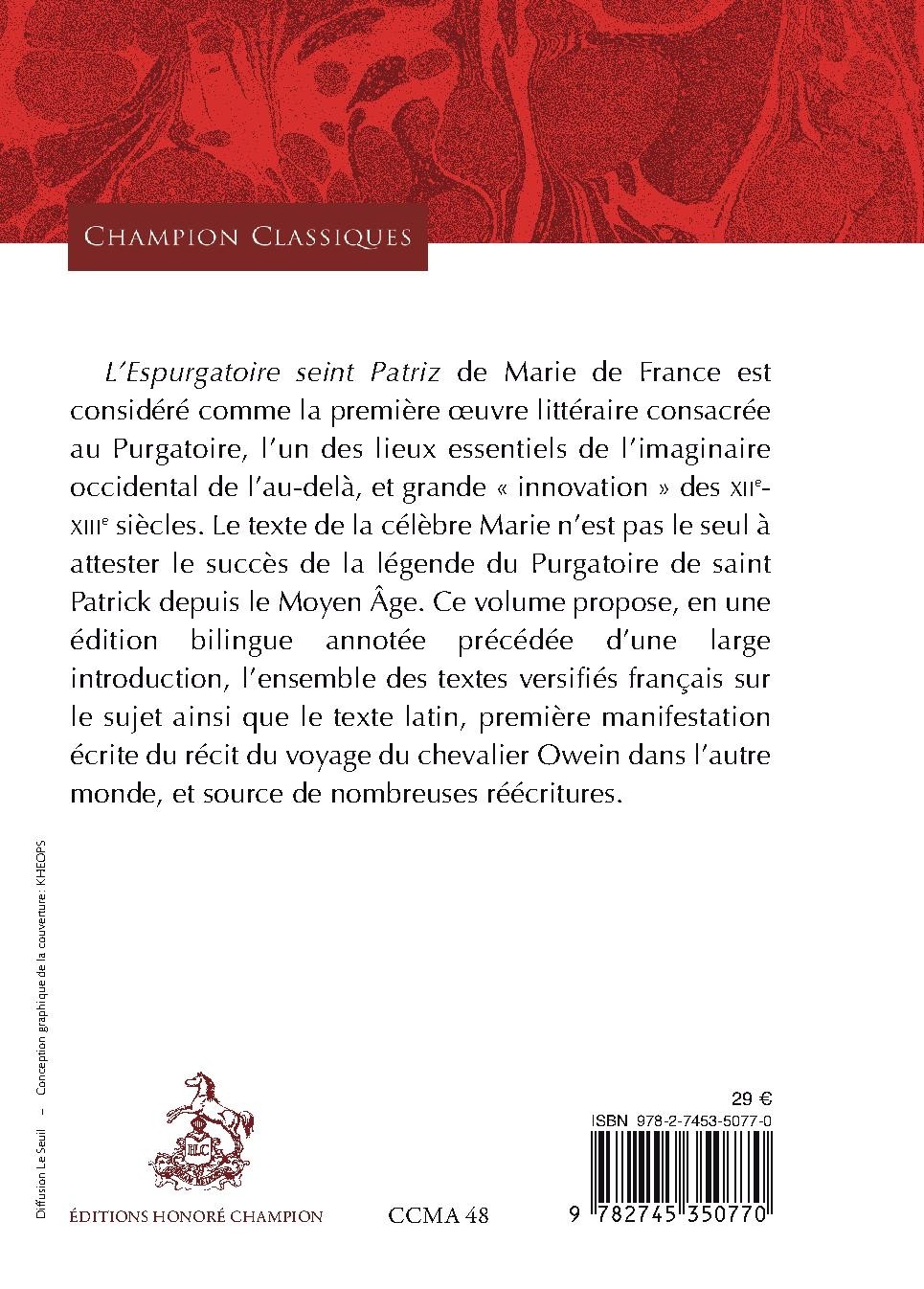 L’Espurgatoire seint Patriz de Marie de France est considéré comme la première oeuvre littéraire consacrée au Purgatoire, l’un des lieux essentiels de l’imaginaire occidental de l’au-delà, et grande « innovation » des XIIe- XIIIe siècles. Le texte de la célèbre Marie n’est pas le seul à attester le succès de la légende du Purgatoire de saint Patrick depuis le Moyen Âge. Ce volume propose, en une édition bilingue annotée précédée d’une large introduction, l’ensemble des textes versifiés français sur le sujet ainsi que le texte latin, première manifestation écrite du récit du voyage du chevalier Owein dans l’autre monde, et source de nombreuses réécritures.