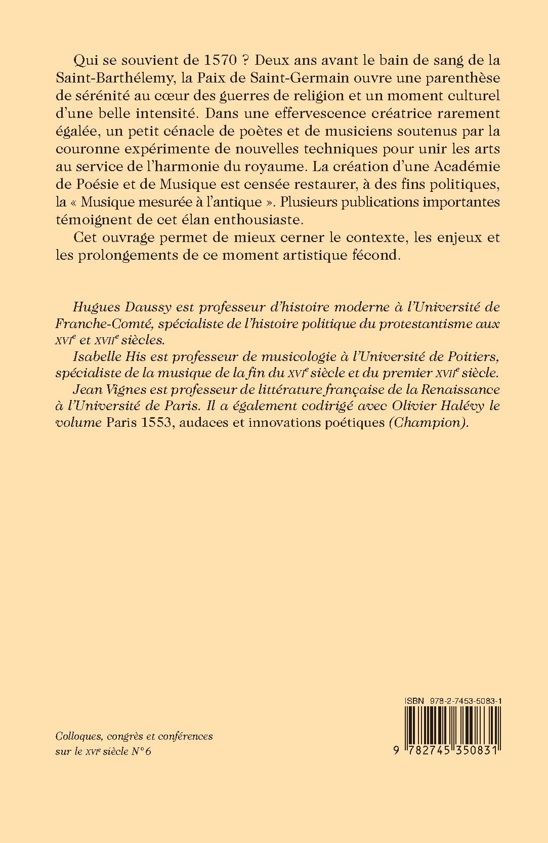 Qui se souvient de 1570 ? Deux ans avant le bain de sang de la Saint-Barthélemy, la Paix de Saint-Germain ouvre une parenthèse de sérénité au cœur des guerres de religion et un moment culturel d’une belle intensité. Dans une effervescence créatrice rarement égalée, un petit cénacle de poètes et de musiciens soutenus par la couronne expérimente de nouvelles techniques pour unir les arts au service de l’harmonie du royaume. La création d’une Académie de Poésie et de Musique est censée restaurer, à des fins politiques, la « Musique mesurée à l’antique ». Plusieurs publications importantes témoignent de cet élan enthousiaste.