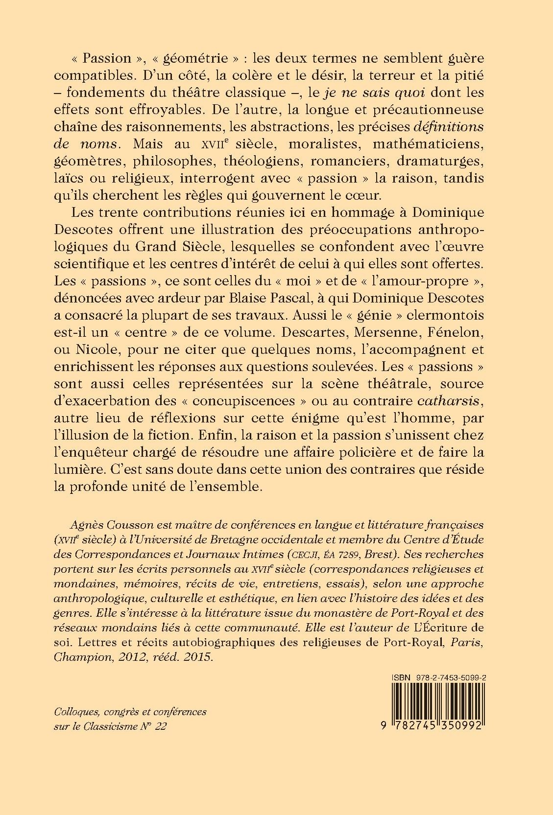 « Passion », « géométrie » : les deux termes ne semblent guère compatibles. D’un côté, la colère et le désir, la terreur et la pitié – fondements du théâtre classique –, le je ne sais quoi dont les effets sont effroyables. De l’autre, la longue et précautionneuse chaîne des raisonnements, les abstractions, les précises définitions de noms. Mais au XVIIe siècle, moralistes, mathématiciens, géomètres, philosophes, théologiens, romanciers, dramaturges, laïcs ou religieux, interrogent avec « passion » la raison, tandis qu’ils cherchent les règles qui gouvernent le cœur.