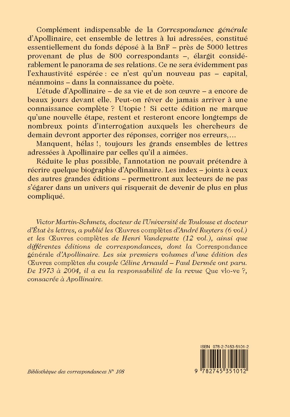 Complément indispensable de la Correspondance générale d’Apollinaire, cet ensemble de lettres à lui adressées, constitué essentiellement du fonds déposé à la BnF – près de 5000 lettres provenant de plus de 800 correspondants – élargit considérablement le panorama de ses relations. Ce ne sera évidemment pas l’exhaustivité espérée : ce n’est qu’un nouveau pas – capital, néanmoins – dans la connaissance du poète.