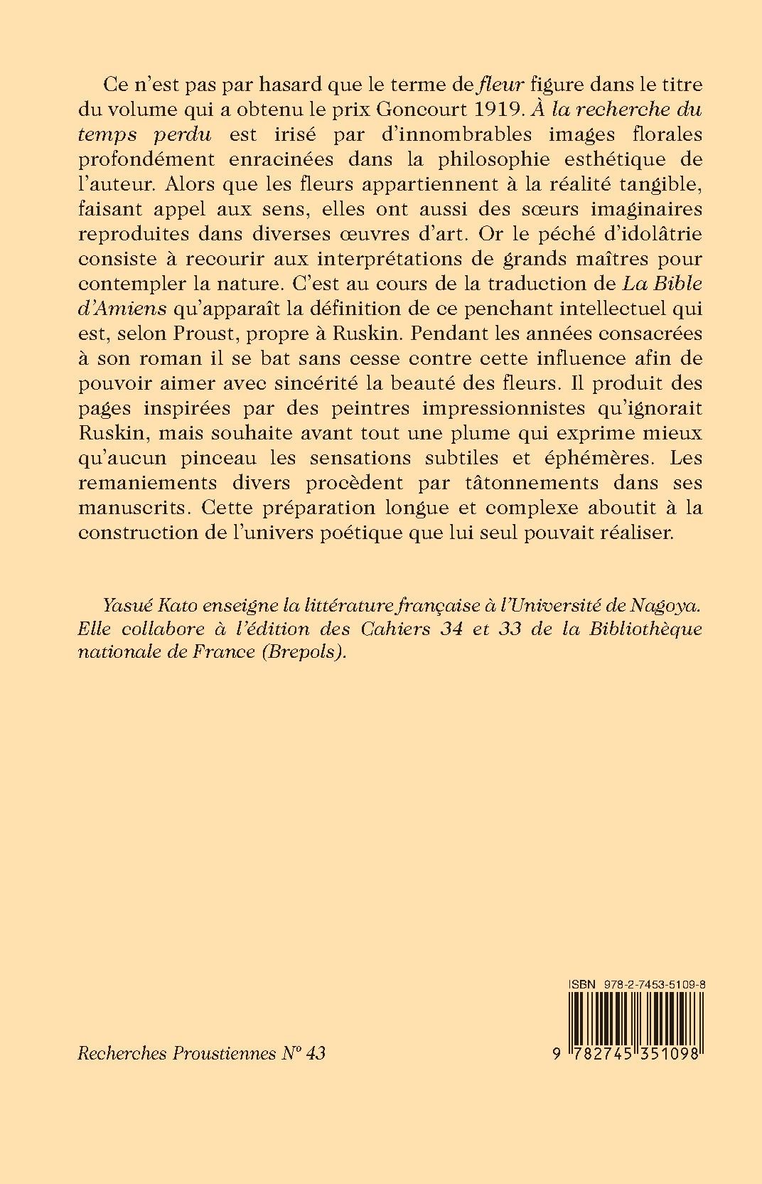 Ce n’est pas par hasard que le terme de fleur figure dans le titre du volume qui a obtenu le prix Goncourt 1919. À la recherche du temps perdu est irisé par d’innombrables images florales profondément enracinées dans la philosophie esthétique de l’auteur. Alors que les fleurs appartiennent à la réalité tangible, faisant appel aux sens, elles ont aussi des sœurs imaginaires reproduites dans diverses œuvres d’art. Or le péché d’idolâtrie consiste à recourir aux interprétations de grands maîtres pour contempler la nature. C’est au cours de la traduction de La Bible d’Amiens qu’apparaît la définition de ce penchant intellectuel qui est, selon Proust, propre à Ruskin. Pendant les années consacrées à son roman il se bat sans cesse contre cette influence afin de pouvoir aimer avec sincérité la beauté des fleurs. Il produit des pages inspirées par des peintres impressionnistes qu’ignorait Ruskin, mais souhaite avant tout une plume qui exprime mieux qu’aucun pinceau les sensations subtiles et éphémères. Les remaniements divers procèdent par tâtonnements dans ses manuscrits. Cette préparation longue et complexe aboutit à la construction de l’univers poétique que lui seul pouvait réaliser.