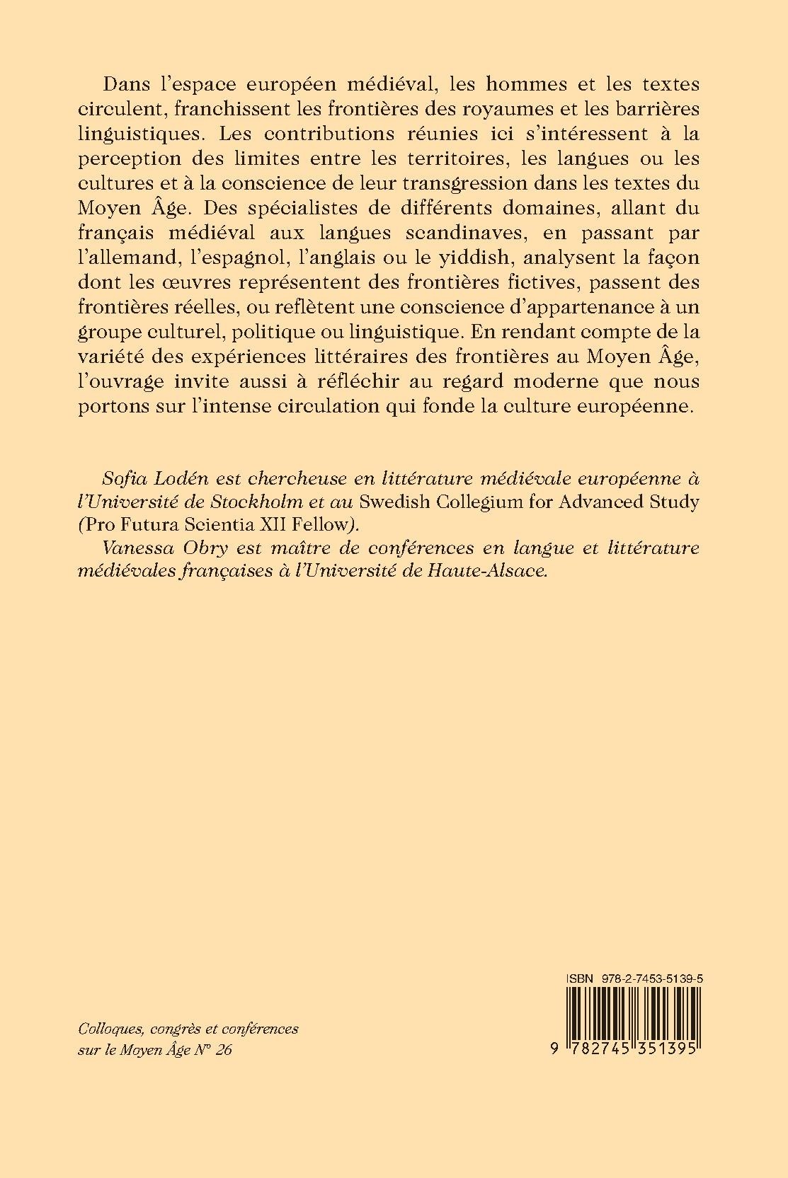Dans l’espace européen médiéval, les hommes et les textes circulent, franchissent les frontières des royaumes et les barrières linguistiques. Les contributions réunies ici s’intéressent à la perception des limites entre les territoires, les langues ou les cultures et à la conscience de leur transgression dans les textes du Moyen Âge. Des spécialistes de différents domaines, allant du français médiéval aux langues scandinaves, en passant par l’allemand, l’espagnol, l’anglais ou le yiddish, analysent la façon dont les œuvres représentent des frontières fictives, passent des frontières réelles, ou reflètent une conscience d’appartenance à un groupe culturel, politique ou linguistique. En rendant compte de la variété des expériences littéraires des frontières au Moyen Âge, l’ouvrage invite aussi à réfléchir au regard moderne que nous portons sur l’intense circulation qui fonde la culture européenne.