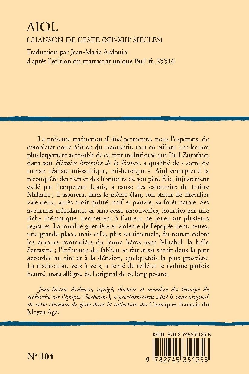 La présente traduction d’Aiol permettra, nous l’espérons, de compléter notre édition du manuscrit, tout en offrant une lecture plus largement accessible de ce récit multiforme que Paul Zumthor, dans son Histoire littéraire de la France, a qualifié de « sorte de roman réaliste mi-satirique, mi-héroïque ». Aiol entreprend la reconquête des fiefs et des honneurs de son père Élie, injustement exilé par l’empereur Louis, à cause des calomnies du traître Makaire ; il assurera, dans le même élan, son statut de chevalier valeureux, après avoir quitté, naïf et pauvre, sa forêt natale. Ses aventures trépidantes et sans cesse renouvelées, nourries par une riche thématique, permettent à l’auteur de jouer sur plusieurs registres. La tonalité guerrière et violente de l’épopée tient, certes, une grande place, mais celle, plus sentimentale, du roman colore les amours contrariées du jeune héros avec Mirabel, la belle Sarrasine ; l’influence du fabliau se fait aussi sentir dans la part accordée au rire et à la dérision, quelquefois la plus grossière. La traduction, vers à vers, a tenté de refléter le rythme parfois heurté, mais allègre, de l’original de ce long poème.