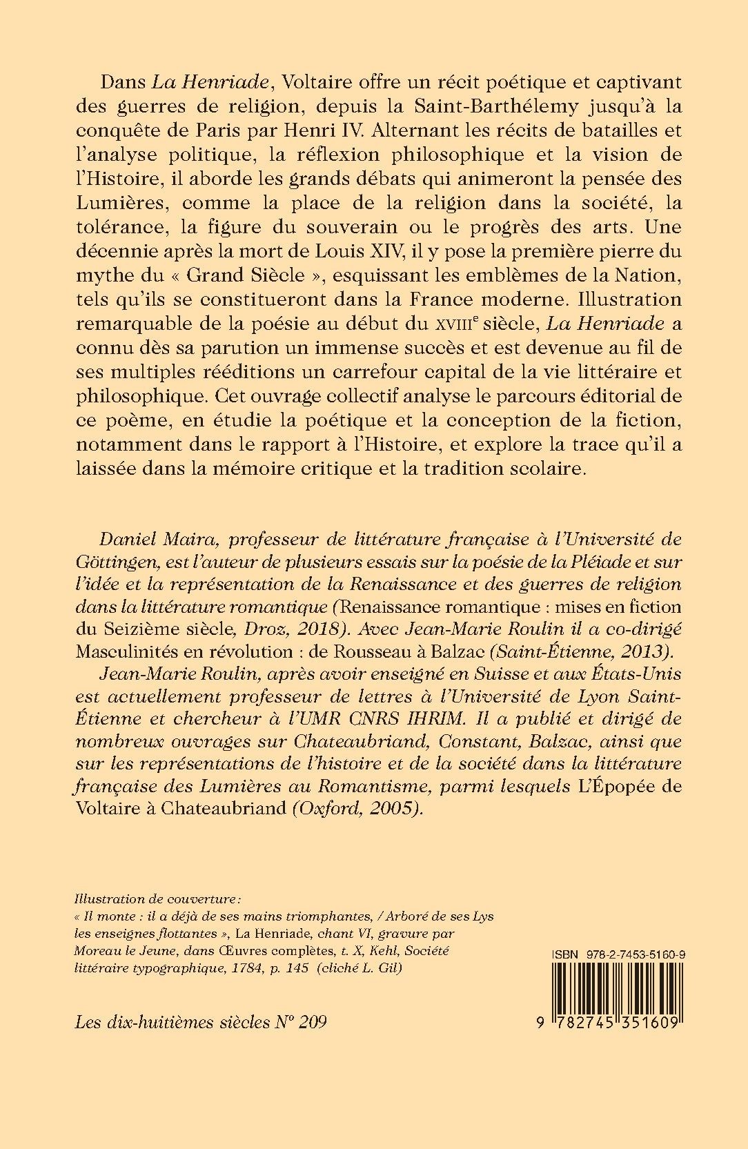 Dans La Henriade, Voltaire offre un récit poétique et captivant des guerres de religion, depuis la Saint-Barthélemy jusqu’à la conquête de Paris par Henri IV. Alternant les récits de batailles et l’analyse politique, la réflexion philosophique et la vision de l’Histoire, il aborde les grands débats qui animeront la pensée des Lumières, comme la place de la religion dans la société, la tolérance, la figure du souverain ou le progrès des arts. Une décennie après la mort de Louis XIV, il y pose la première pierre du mythe du « Grand Siècle », esquissant les emblèmes de la Nation, tels qu’ils se constitueront dans la France moderne. Illustration remarquable de la poésie au début du XVIIIe siècle, La Henriade a connu dès sa parution un immense succès et est devenue au fil de ses multiples rééditions un carrefour capital de la vie littéraire et philosophique. Cet ouvrage collectif analyse le parcours éditorial de ce poème, en étudie la poétique et la conception de la fiction, notamment dans le rapport à l’Histoire, et explore la trace qu’il a laissée dans la mémoire critique et la tradition scolaire.
