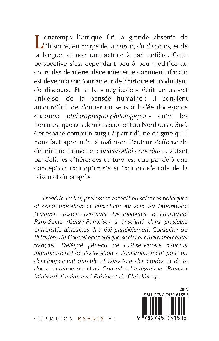 Au cours des dernières décennies, le continent africain est devenu acteur de l’histoire et producteur de discours. Et si la « négritude » était un aspect universel de la pensée humaine ? « Besoin d’Afrique », « L’Afrique au secours de l’Occident », « L’Afrique a été ma véritable Sorbonne », « L’Afrique est notre avenir », « Le continent de la mondialisation, c’est l’Afrique », autant d’expressions qui manifestent l’aspiration que peuvent ressentir les sociétés européennes vis-à-vis du continent noir. Pline l’ancien affirmait déjà il y a 2000 ans : « De l’Afrique, sort toujours du nouveau ». Il convient aujourd’hui de donner un sens à l’idée d’un « espace commun philosophique-philologique » entre les hommes, que ces derniers habitent au Nord ou au Sud. Cet espace commun surgit à partir d’une énigme qu’il nous faut apprendre à maîtriser. L’auteur s’efforce de définir une nouvelle « universalité concrète », autant par-delà les différences culturelles, que par-delà une conception trop optimiste et trop occidentale de la raison et du progrès.