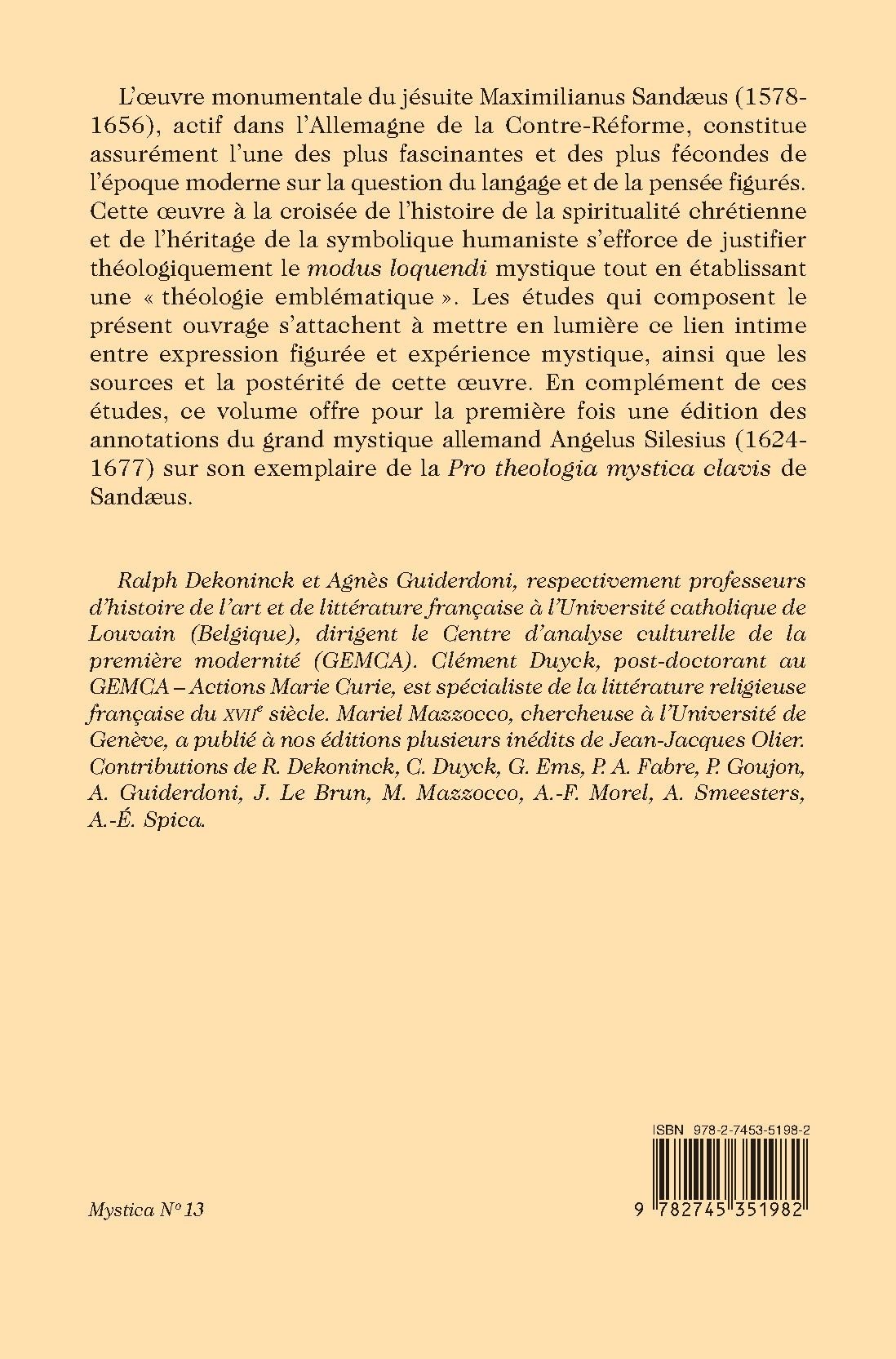 L’œuvre monumentale du jésuite Maximilianus Sandæus (1578- 1656), actif dans l’Allemagne de la Contre-Réforme, constitue assurément l’une des plus fascinantes et des plus fécondes de l’époque moderne sur la question du langage et de la pensée figurés. Cette oeuvre à la croisée de l’histoire de la spiritualité chrétienne et de l’héritage de la symbolique humaniste s’efforce de justifier théologiquement le modus loquendi mystique tout en établissant une « théologie emblématique ». Les études qui composent le présent ouvrage s’attachent à mettre en lumière ce lien intime entre expression figurée et expérience mystique, ainsi que les sources et la postérité de cette oeuvre. En complément de ces études, ce volume offre pour la première fois une édition des annotations du grand mystique allemand Angelus Silesius (1624-1677) sur son exemplaire de la Pro theologia mystica clavis de Sandæus.