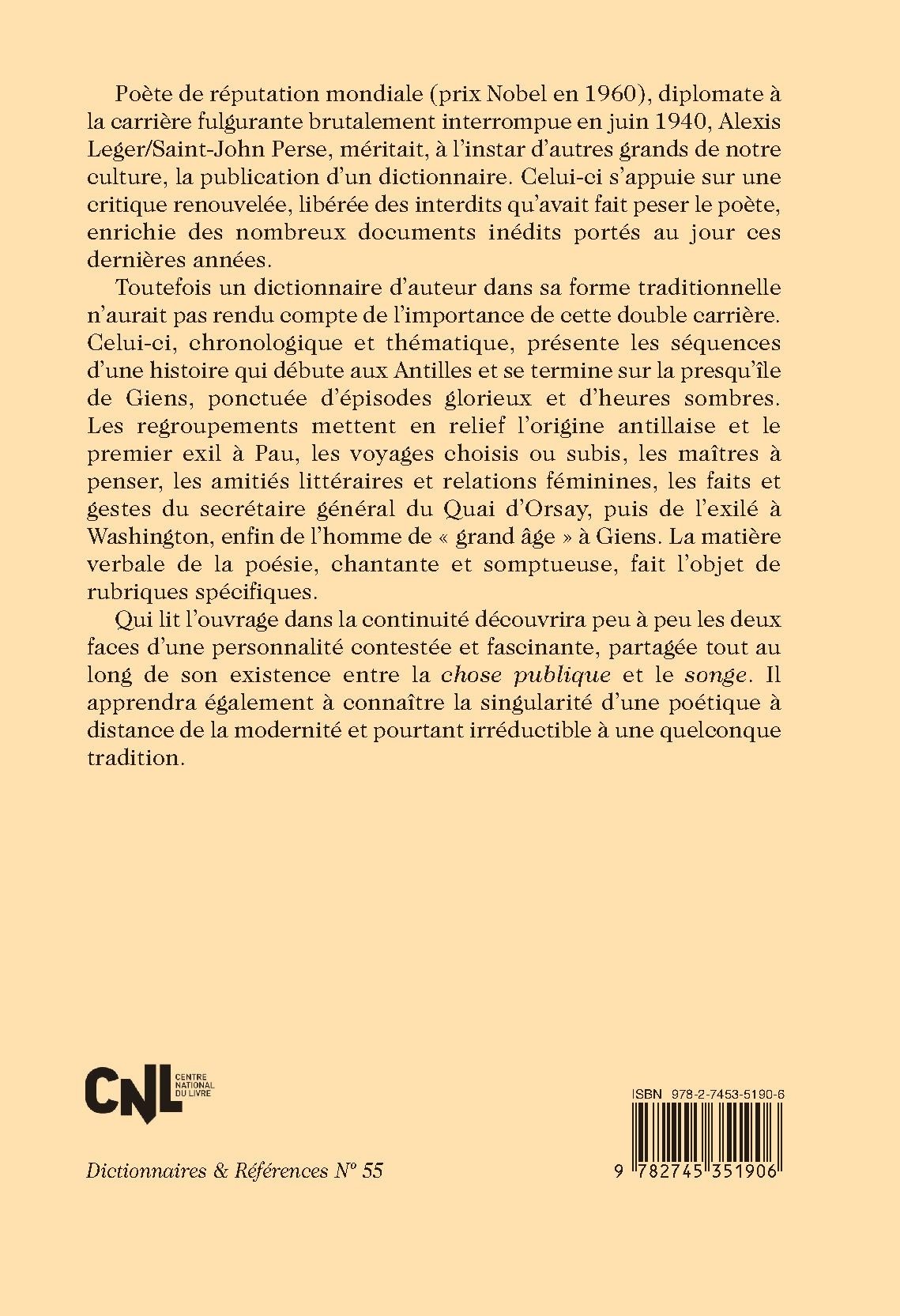 Toutefois un dictionnaire d’auteur dans sa forme traditionnelle n’aurait pas rendu compte de l’importance de cette double carrière. Celui-ci, chronologique et thématique, présente les séquences d’une histoire qui débute aux Antilles et se termine sur la presqu’île de Giens, ponctuée d’épisodes glorieux et d’heures sombres. Les regroupements mettent en relief l’origine antillaise et le premier exil à Pau, les voyages choisis ou subis, les maîtres à penser, les amitiés littéraires et relations féminines, les faits et gestes du secrétaire général du Quai d’Orsay, puis de l’exilé à Washington, enfin de l’homme de « grand âge » à Giens. La matière verbale de la poésie, chantante et somptueuse, fait l’objet de rubriques spécifiques.