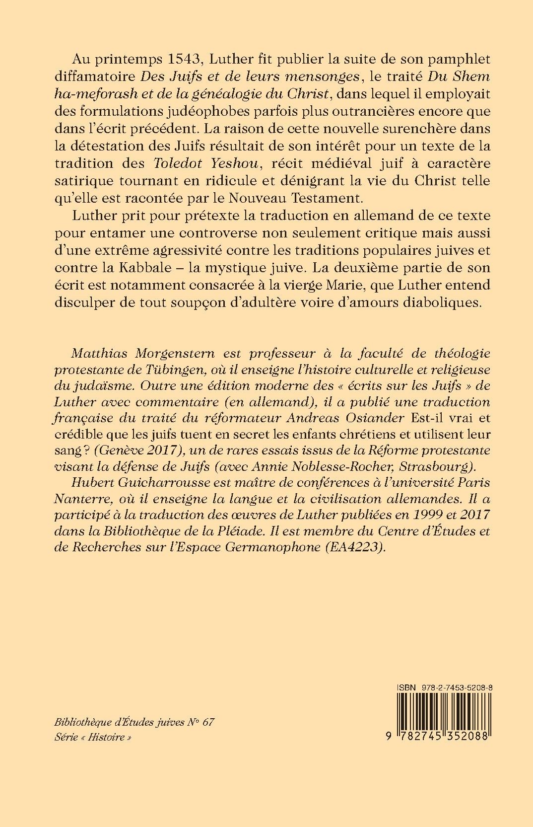 Au printemps 1543, Luther fit publier la suite de son pamphlet diffamatoire Des Juifs et de leurs mensonges, le traité Du Shem ha-meforash et de la généalogie du Christ, dans lequel il employait des formulations judéophobes parfois plus outrancières encore que dans l’écrit précédent. La raison de cette nouvelle surenchère dans la détestation des Juifs résultait de son intérêt pour un texte de la tradition des Toledot Yeshou, récit médiéval juif à caractère satirique tournant en ridicule et dénigrant la vie du Christ telle qu’elle est racontée par le Nouveau Testament.