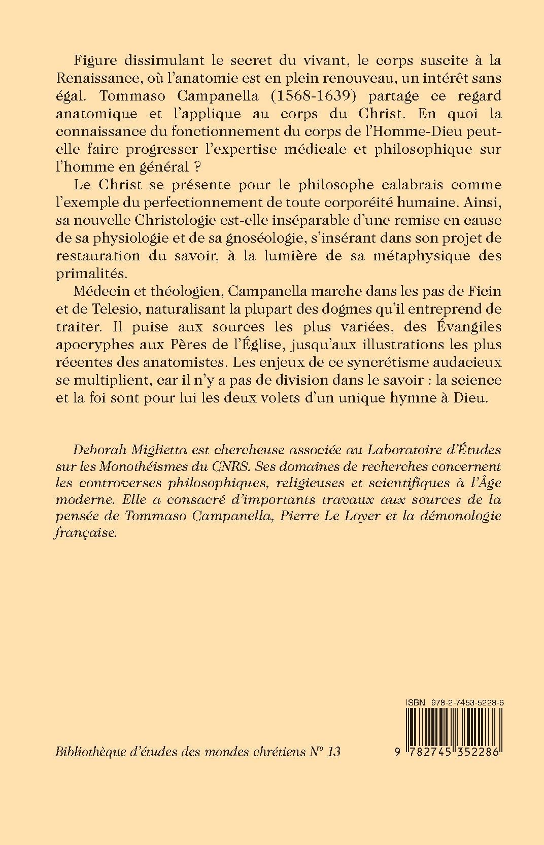 Figure dissimulant le secret du vivant, le corps suscite à la Renaissance, où l’anatomie est en plein renouveau, un intérêt sans égal. Tommaso Campanella (1568-1639) partage ce regard anatomique et l’applique au corps du Christ. En quoi la connaissance du fonctionnement du corps de l’Homme-Dieu peut-elle faire progresser l’expertise médicale et philosophique sur l’homme en général ?