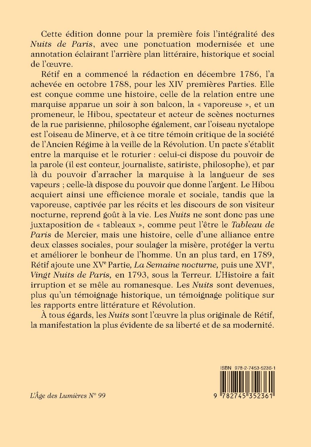 Cette édition donne pour la première fois l’intégralité des Nuits de Paris, avec une ponctuation modernisée et une annotation éclairant l’arrière plan littéraire, historique et social de l’œuvre.