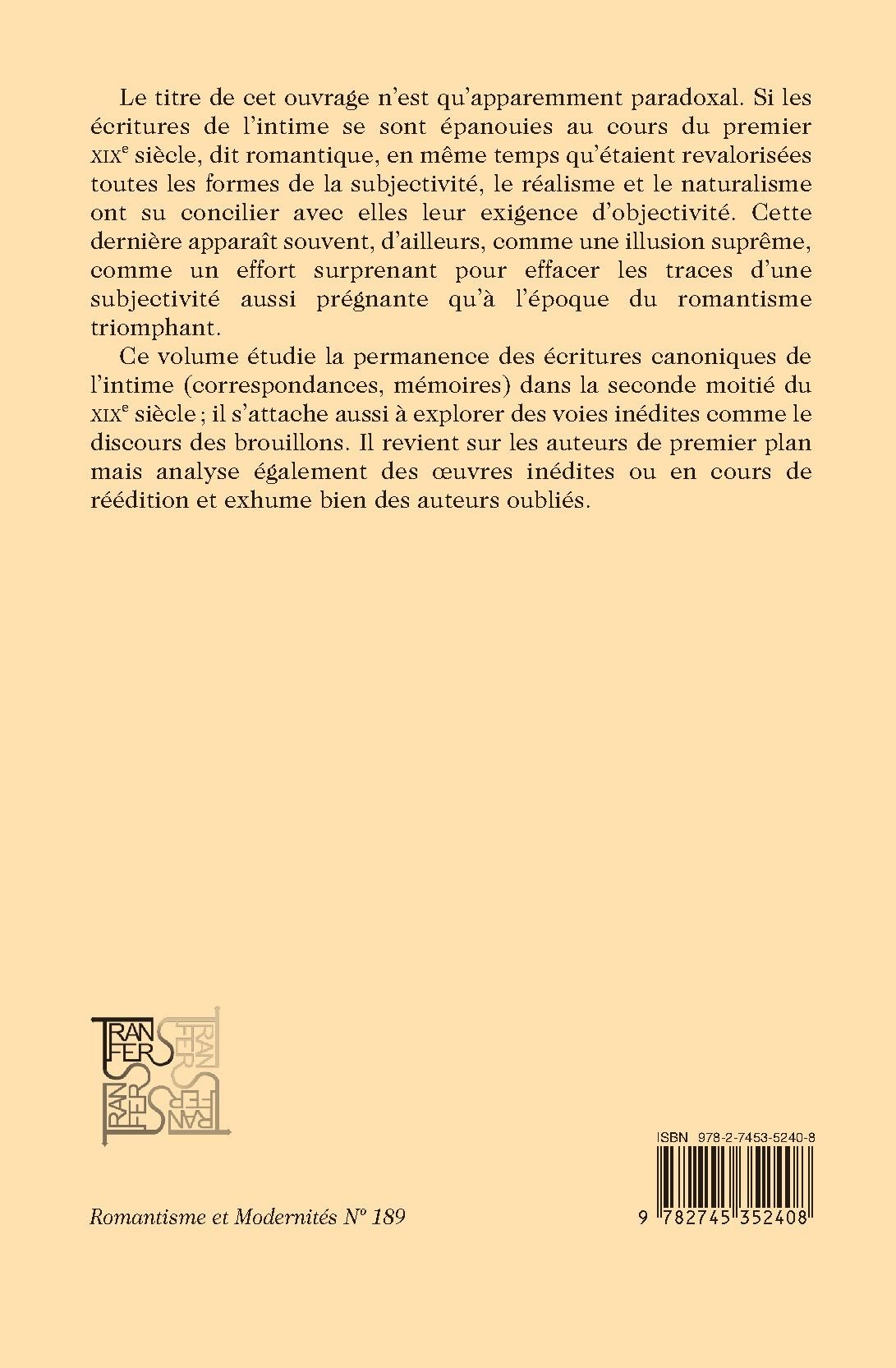 Le titre de cet ouvrage n’est qu’apparemment paradoxal. Si les écritures de l’intime se sont épanouies au cours du premier XIXe siècle, dit romantique, en même temps qu’étaient revalorisées toutes les formes de la subjectivité, le réalisme et le naturalisme ont su concilier avec elles leur exigence d’objectivité. Cette dernière apparaît souvent, d’ailleurs, comme une illusion suprême, comme un effort surprenant pour effacer les traces d’une subjectivité aussi prégnante qu’à l’époque du romantisme triomphant. Ce volume étudie la permanence des écritures canoniques de l’intime (correspondances, mémoires) dans la seconde moitié du XIXe siècle ; il s’attache aussi à explorer des voies inédites comme le discours des brouillons. Il revient sur les auteurs de premier plan mais analyse également des œuvres inédites ou en cours de réédition et exhume bien des auteurs oubliés.