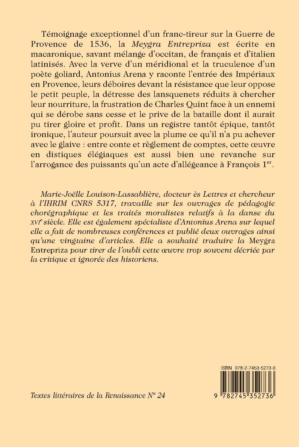 Témoignage exceptionnel d’un franc-tireur sur la Guerre de Provence de 1536, la Meygra Entrepriza est écrite en macaronique, savant mélange d’occitan, de français et d’italien latinisés. Avec la verve d’un méridional et la truculence d’un poète goliard, Antonius Arena y raconte l’entrée des Impériaux en Provence, leurs déboires devant la résistance que leur oppose le petit peuple, la détresse des lansquenets réduits à chercher leur nourriture, la frustration de Charles Quint face à un ennemi qui se dérobe sans cesse et le prive de la bataille dont il aurait pu tirer gloire et profit. Dans un registre tantôt épique, tantôt ironique, l’auteur poursuit avec la plume ce qu’il n’a pu achever avec le glaive : entre conte et règlement de comptes, cette œuvre en distiques élégiaques est aussi bien une revanche sur l’arrogance des puissants qu’un acte d’allégeance à François 1er.