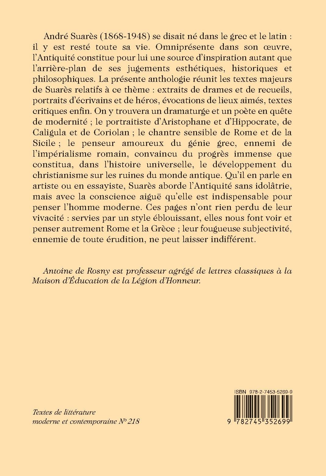 André Suarès (1868-1948) se disait né dans le grec et le latin : il y est resté toute sa vie. Omniprésente dans son oeuvre, l’Antiquité constitue pour lui une source d’inspiration autant que l’arrière-plan de ses jugements esthétiques, historiques et philosophiques. La présente anthologie réunit les textes majeurs de Suarès relatifs à ce thème : extraits de drames et de recueils, portraits d’écrivains et de héros, évocations de lieux aimés, textes critiques enfin. On y trouvera un dramaturge et un poète en quête de modernité ; le portraitiste d’Aristophane et d’Hippocrate, de Caligula et de Coriolan ; le chantre sensible de Rome et de la Sicile ; le penseur amoureux du génie grec, ennemi de l’impérialisme romain, convaincu du progrès immense que constitua, dans l’histoire universelle, le développement du christianisme sur les ruines du monde antique. Qu’il en parle en artiste ou en essayiste, Suarès aborde l’Antiquité sans idolâtrie, mais avec la conscience aiguë qu’elle est indispensable pour penser l’homme moderne. Ces pages n’ont rien perdu de leur vivacité : servies par un style éblouissant, elles nous font voir et penser autrement Rome et la Grèce ; leur fougueuse subjectivité, ennemie de toute érudition, ne peut laisser indifférent.