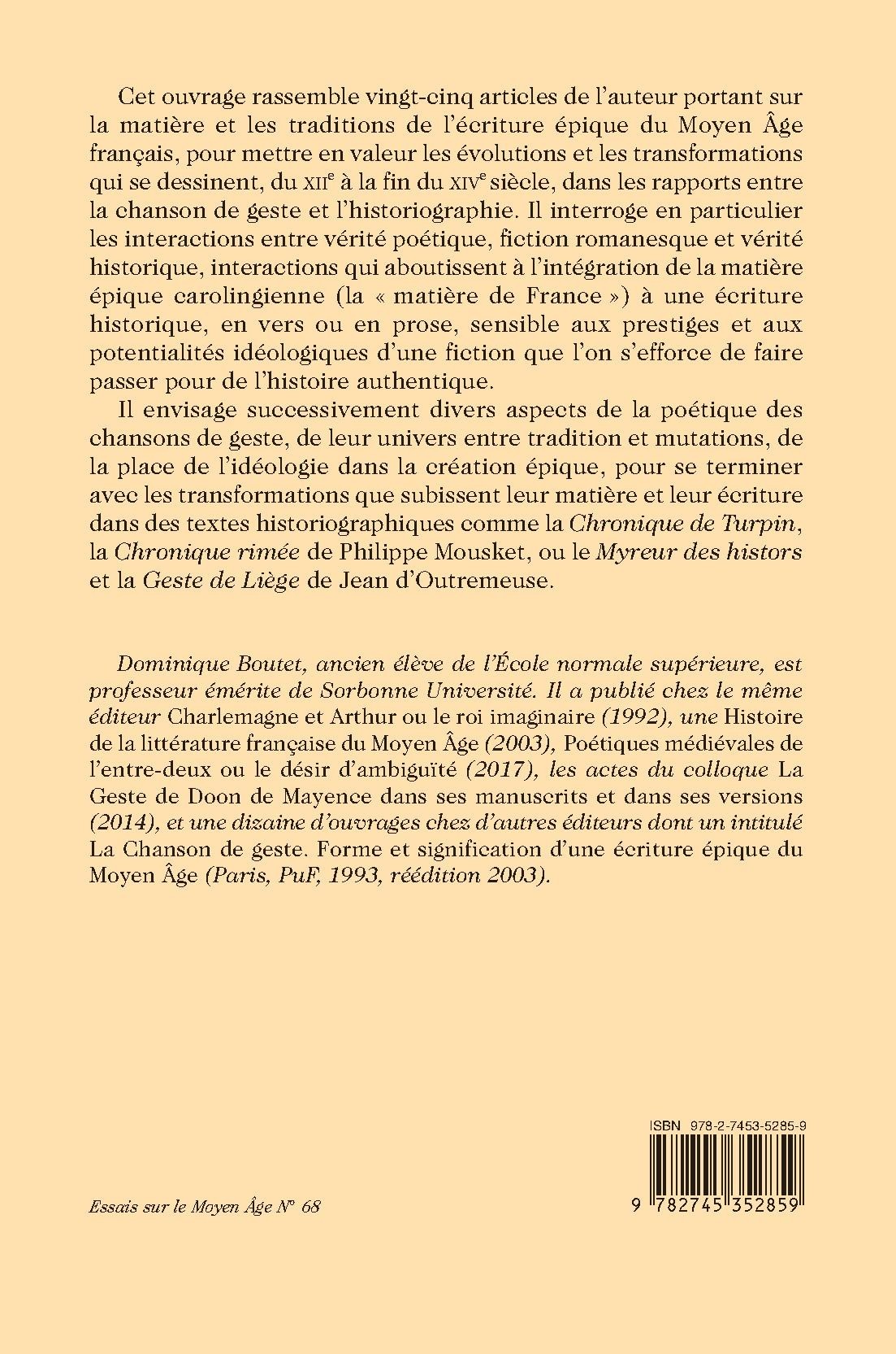 Il envisage successivement divers aspects de la poétique des chansons de geste, de leur univers entre tradition et mutations, de la place de l’idéologie dans la création épique, pour se terminer avec les transformations que subissent leur matière et leur écriture dans des textes historiographiques comme la Chronique de Turpin, la Chronique rimée de Philippe Mousket, ou le Myreur des histors et la Geste de Liège de Jean d’Outremeuse.
