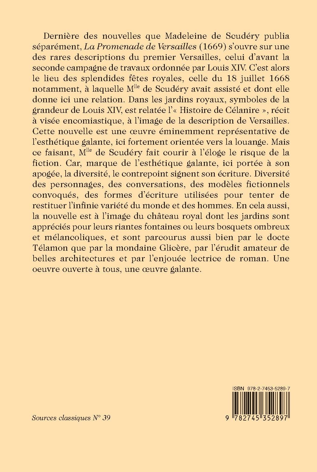 Dernière des nouvelles que Madeleine de Scudéry publia séparément, La Promenade de Versailles (1669) s’ouvre sur une des rares descriptions du premier Versailles, celui d’avant la seconde campagne de travaux ordonnée par Louis XIV. C’est alors le lieu des splendides fêtes royales, celle du 18 juillet 1668 notamment, à laquelle Mlle de Scudéry avait assisté et dont elle donne ici une relation. Dans les jardins royaux, symboles de la grandeur de Louis XIV, est relatée l’« Histoire de Célanire », récit à visée encomiastique, à l’image de la description de Versailles. Cette nouvelle est une œuvre éminemment représentative de l’esthétique galante, ici fortement orientée vers la louange. Mais ce faisant, Mlle de Scudéry fait courir à l’éloge le risque de la fiction. Car, marque de l’esthétique galante, ici portée à son apogée, la diversité, le contrepoint signent son écriture. Diversité des personnages, des conversations, des modèles fictionnels convoqués, des formes d’écriture utilisées pour tenter de restituer l’infinie variété du monde et des hommes. En cela aussi, la nouvelle est à l’image du château royal dont les jardins sont appréciés pour leurs riantes fontaines ou leurs bosquets ombreux et mélancoliques, et sont parcourus aussi bien par le docte Télamon que par la mondaine Glicère, par l’érudit amateur de belles architectures et par l’enjouée lectrice de roman. Une œuvre ouverte à tous, une œuvre galante.