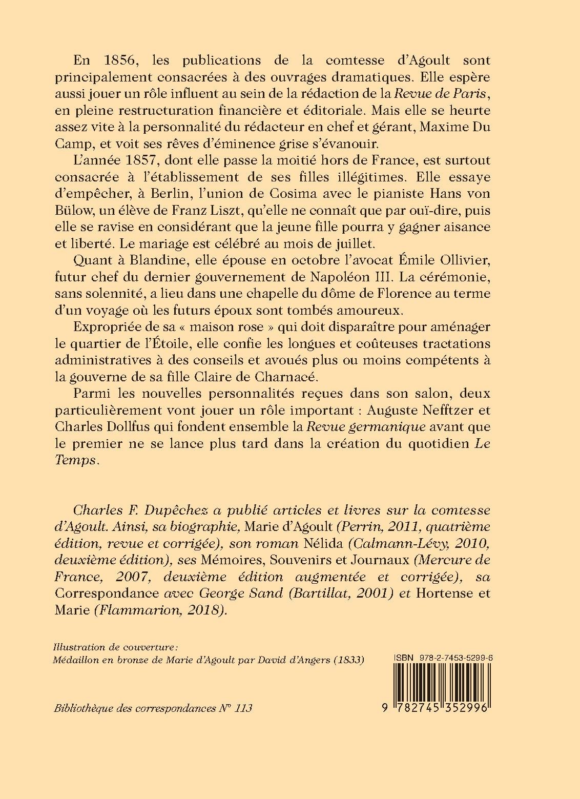 Charles F. Dupêchez a publié articles et livres sur la comtesse d’Agoult. Ainsi, sa biographie, Marie d’Agoult (Perrin, 2011, quatrième édition, revue et corrigée), son roman Nélida (Calmann-Lévy, 2010, deuxième édition), ses Mémoires, Souvenirs et Journaux (Mercure de France, 2007, deuxième édition augmentée et corrigée), sa Correspondance avec George Sand (Bartillat, 2001) et Hortense et Marie (Flammarion, 2018).