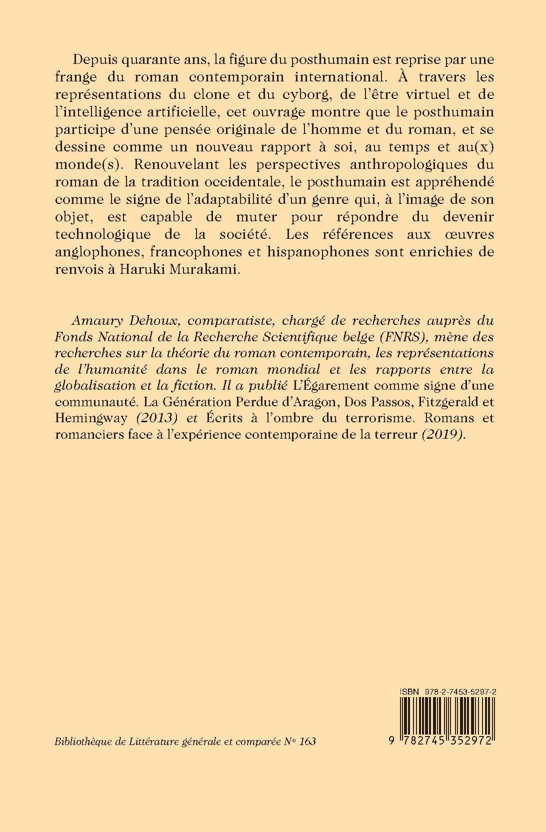 Depuis quarante ans, la figure du posthumain est reprise par une frange du roman contemporain international. À travers les représentations du clone et du cyborg, de l’être virtuel et de l’intelligence artificielle, cet ouvrage montre que le posthumain participe d’une pensée originale de l’homme et du roman, et se dessine comme un nouveau rapport à soi, au temps et au(x) monde(s). Renouvelant les perspectives anthropologiques du roman de la tradition occidentale, le posthumain est appréhendé comme le signe de l’adaptabilité d’un genre qui, à l’image de son objet, est capable de muter pour répondre du devenir technologique de la société. Les références aux œuvres anglophones, francophones et hispanophones sont enrichies de renvois à Haruki Murakami.
