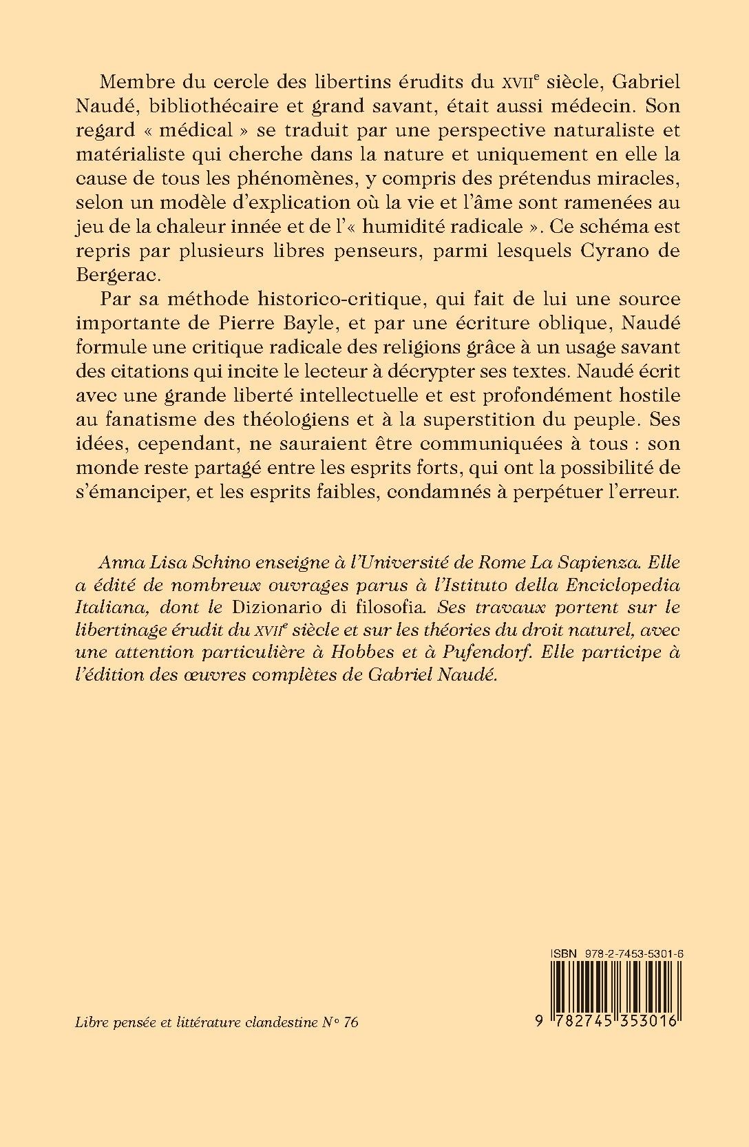 Membre du cercle des libertins érudits du XVIIe siècle, Gabriel Naudé, bibliothécaire et grand savant, était aussi médecin. Son regard « médical » se traduit par une perspective naturaliste et matérialiste qui cherche dans la nature et uniquement en elle la cause de tous les phénomènes, y compris des prétendus miracles, selon un modèle d’explication où la vie et l’âme sont ramenées au jeu de la chaleur innée et de l’ « humidité radicale ». Ce schéma est repris par plusieurs libres penseurs, parmi lesquels Cyrano de Bergerac.