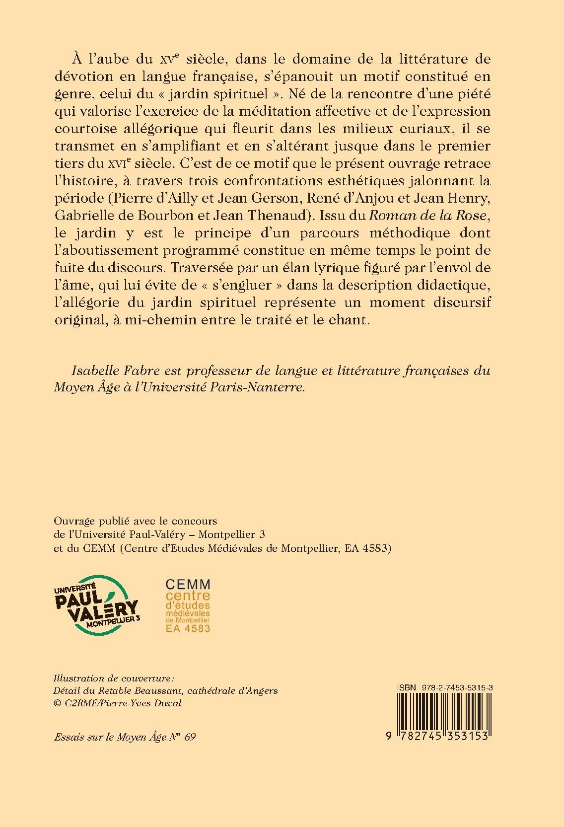 À l’aube du XVe siècle, dans le domaine de la littérature de dévotion en langue française, s’épanouit un motif constitué en genre, celui du « jardin spirituel ». Né de la rencontre d’une piété qui valorise l’exercice de la méditation affective et de l’expression courtoise allégorique qui fleurit dans les milieux curiaux, il se transmet en s’amplifiant et en s’altérant jusque dans le premier tiers du XVIe siècle. C’est de ce motif que le présent ouvrage retrace l’histoire, à travers trois confrontations esthétiques jalonnant la période (Pierre d’Ailly et Jean Gerson, René d’Anjou et Jean Henry, Gabrielle de Bourbon et Jean Thenaud). Issu du Roman de la Rose, le jardin y est le principe d’un parcours méthodique dont l’aboutissement programmé constitue en même temps le point de fuite du discours. Traversée par un élan lyrique figuré par l’envol de l’âme, qui lui évite de « s’engluer » dans la description didactique, l’allégorie du jardin spirituel représente un moment discursif original, à mi-chemin entre le traité et le chant.