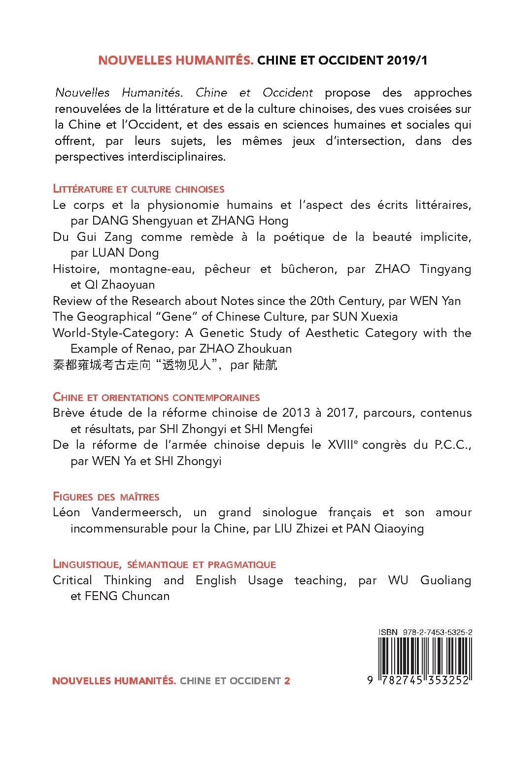 Nouvelles Humanités. Chine et Occident propose des approches renouvelées de la littérature et de la culture chinoises, des vues croisées sur la Chine et l’Occident, et des essais en sciences humaines et sociales qui offrent, par leurs sujets, les mêmes jeux d’intersection, dans des perspectives interdisciplinaires.