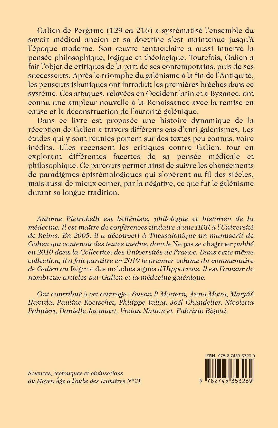 Dans ce livre est proposée une histoire dynamique de la réception de Galien à travers différents cas d’anti-galénismes. Les études qui y sont réunies portent sur des textes peu connus, voire inédits. Elles recensent les critiques contre Galien, tout en explorant différentes facettes de sa pensée médicale et philosophique. Ce parcours permet ainsi de suivre les changements de paradigmes épistémologiques qui s’opèrent au fil des siècles, mais aussi de mieux cerner, par la négative, ce que fut le galénisme durant sa longue tradition.
