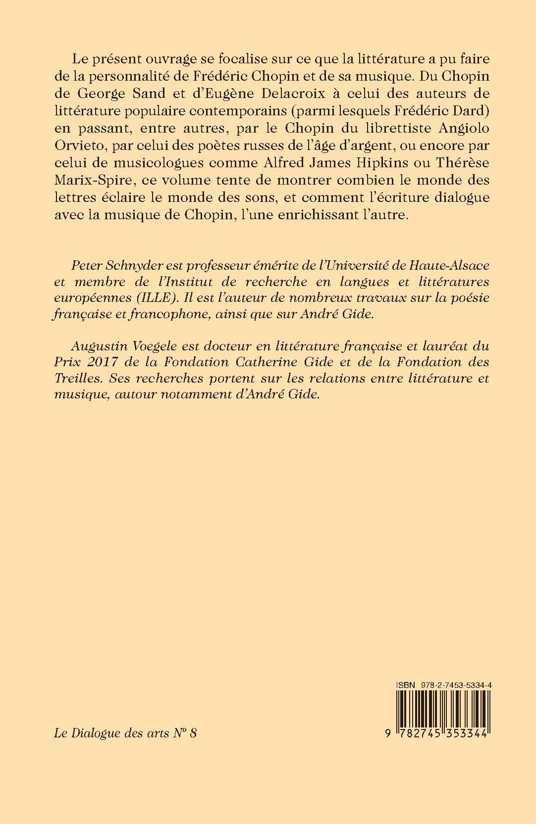 Le présent ouvrage se focalise sur ce que la littérature a pu faire de la personnalité de Frédéric Chopin et de sa musique. Du Chopin de George Sand et d’Eugène Delacroix à celui des auteurs de littérature populaire contemporains (parmi lesquels Frédéric Dard) en passant, entre autres, par le Chopin du librettiste Angiolo Orvieto, par celui des poètes russes de l’âge d’argent, ou encore par celui de musicologues comme Alfred James Hipkins ou Thérèse Marix-Spire, ce volume tente de montrer combien le monde des lettres éclaire le monde des sons, et comment l’écriture dialogue avec la musique de Chopin, l’une enrichissant l’autre.