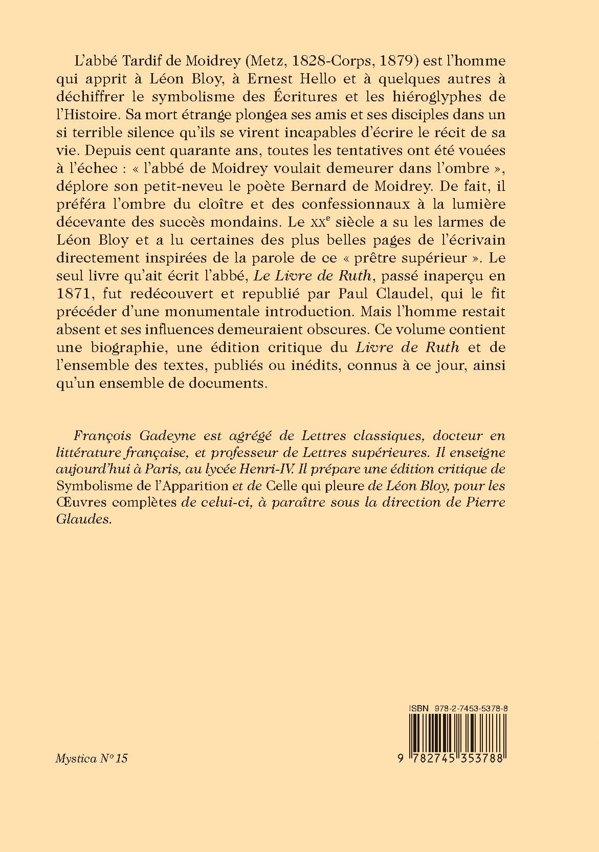 L’abbé Tardif de Moidrey (Metz, 1828-Corps, 1879) est l’homme qui apprit à Léon Bloy, à Ernest Hello et à quelques autres à déchiffrer le symbolisme des Écritures et les hiéroglyphes de l’Histoire. Sa mort étrange plongea ses amis et ses disciples dans un si terrible silence qu’ils se virent incapables d’écrire le récit de sa vie. Depuis cent quarante ans, toutes les tentatives ont été vouées à l’échec : « l’abbé de Moidrey voulait demeurer dans l’ombre », déplore son petit-neveu le poète Bernard de Moidrey. De fait, il préféra l’ombre du cloître et des confessionnaux à la lumière décevante des succès mondains. Le XXe siècle a su les larmes de Léon Bloy et a lu certaines des plus belles pages de l’écrivain directement inspirées de la parole de ce « prêtre supérieur ». Le seul livre qu’ait écrit l’abbé, Le Livre de Ruth, passé inaperçu en 1871, fut redécouvert et republié par Paul Claudel, qui le fit précéder d’une monumentale introduction. Mais l’homme restait absent et ses influences demeuraient obscures. Ce volume contient une biographie, une édition critique du Livre de Ruth et de l’ensemble des textes, publiés ou inédits, connus à ce jour, ainsi qu’un ensemble de documents.