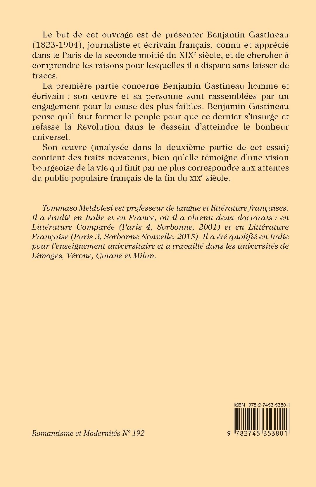 Le but de cet ouvrage est de présenter Benjamin Gastineau (1823-1904), journaliste et écrivain français, connu et apprécié dans le Paris de la seconde moitié du XIXe siècle, et de chercher à comprendre les raisons pour lesquelles il a disparu sans laisser de traces.