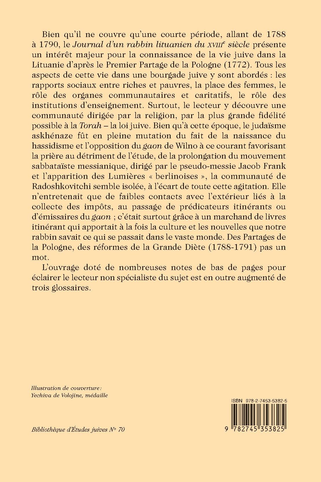 Bien qu’il ne couvre qu’une courte période, allant de 1788 à 1790, le Journal d’un rabbin lituanien du XVIIIe siècle présente un intérêt majeur pour la connaissance de la vie juive dans la Lituanie d’après le Premier Partage de la Pologne (1772). Tous les aspects de cette vie dans une bourgade juive y sont abordés : les rapports sociaux entre riches et pauvres, la place des femmes, le rôle des organes communautaires et caritatifs, le rôle des institutions d’enseignement. Surtout, le lecteur y découvre une communauté dirigée par la religion, par la plus grande fidélité possible à la Torah – la loi juive. Bien qu’à cette époque, le judaïsme askhénaze fût en pleine mutation du fait de la naissance du hassidisme et l’opposition du gaon de Wilno à ce courant favorisant la prière au détriment de l’étude, de la prolongation du mouvement sabbataïste messianique, dirigé par le pseudo-messie Jacob Frank et l’apparition des Lumières « berlinoises », la communauté de Radoshkovitchi semble isolée, à l’écart de toute cette agitation. Elle n’entretenait que de faibles contacts avec l’extérieur liés à la collecte des impôts, au passage de prédicateurs itinérants ou d’émissaires du gaon ; c’était surtout grâce à un marchand de livres itinérant qui apportait à la fois la culture et les nouvelles que notre rabbin savait ce qui se passait dans le vaste monde. Des Partages de la Pologne, des réformes de la Grande Diète (1788-1791) pas un mot.