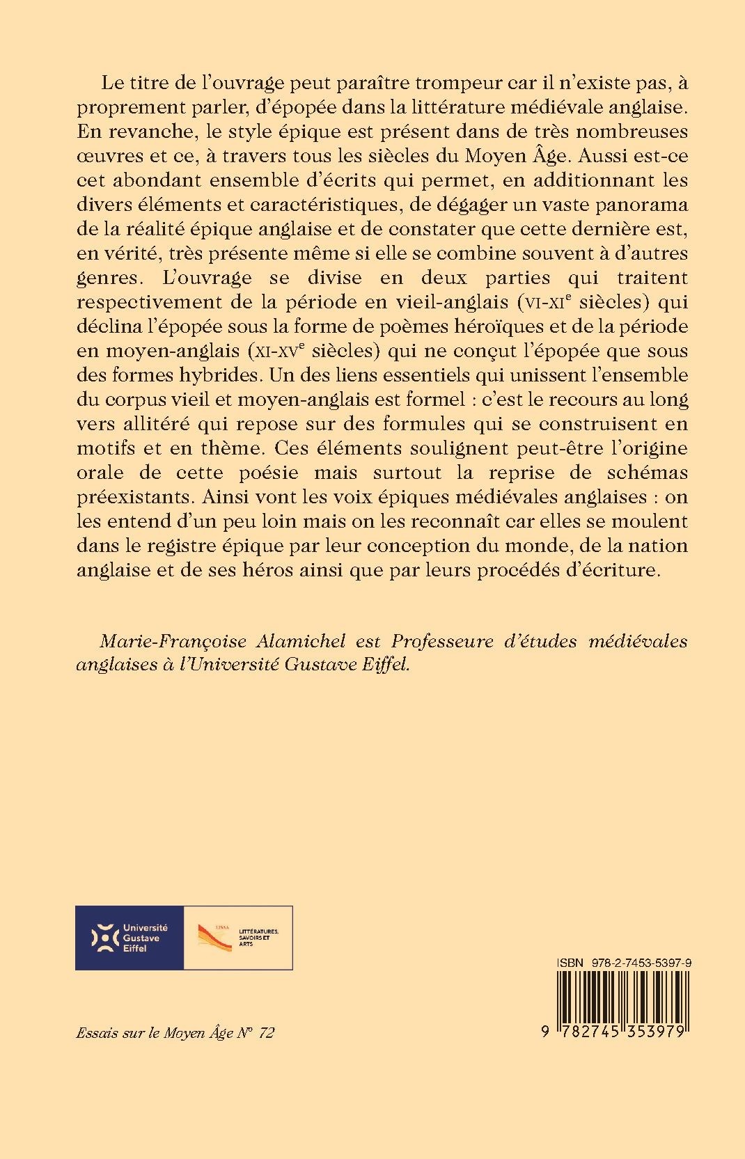 Le titre de l’ouvrage peut paraître trompeur car il n’existe pas, à proprement parler, d’épopée dans la littérature médiévale anglaise. En revanche, le style épique est présent dans de très nombreuses œuvres et ce, à travers tous les siècles du Moyen Âge. Aussi est-ce cet abondant ensemble d’écrits qui permet, en additionnant les divers éléments et caractéristiques, de dégager un vaste panorama de la réalité épique anglaise et de constater que cette dernière est, en vérité, très présente même si elle se combine souvent à d’autres genres. L’ouvrage se divise en deux parties qui traitent respectivement de la période en vieil-anglais (VI-XIe siècles) qui déclina l’épopée sous la forme de poèmes héroïques et de la période en moyen-anglais (XI-XVe siècles) qui ne conçut l’épopée que sous des formes hybrides. Un des liens essentiels qui unissent l’ensemble du corpus vieil et moyen-anglais est formel : c’est le recours au long vers allitéré qui repose sur des formules qui se construisent en motifs et en thème. Ces éléments soulignent peut-être l’origine orale de cette poésie mais surtout la reprise de schémas préexistants. Ainsi vont les voix épiques médiévales anglaises : on les entend d’un peu loin mais on les reconnaît car elles se moulent dans le registre épique par leur conception du monde, de la nation anglaise et de ses héros ainsi que par leurs procédés d’écriture.