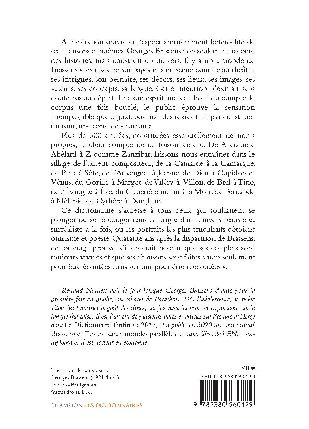 Ce dictionnaire s’adresse à tous ceux qui souhaitent se plonger ou se replonger dans la magie d’un univers réaliste et surréaliste à la fois, où les portraits les plus truculents côtoient onirisme et poésie. Quarante ans après la disparition de Brassens, cet ouvrage prouve, s’il en était besoin, que ses couplets sont toujours vivants et que ses chansons sont faites « non seulement pour être écoutées mais surtout pour être réécoutées ».
