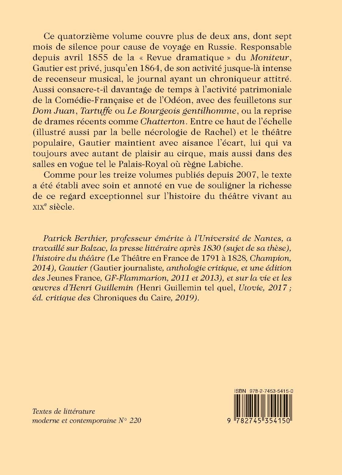 Ce quatorzième volume couvre plus de deux ans, dont sept mois de silence pour cause de voyage en Russie. Responsable depuis avril 1855 de la « Revue dramatique » du Moniteur, Gautier est privé, jusqu’en 1864, de son activité jusque-là intense de recenseur musical, le journal ayant un chroniqueur attitré. Aussi consacre-t-il davantage de temps à l’activité patrimoniale de la Comédie-Française et de l’Odéon, avec des feuilletons sur Dom Juan, Tartuffe ou Le Bourgeois gentilhomme, ou la reprise de drames récents comme Chatterton. Entre ce haut de l’échelle (illustré aussi par la belle nécrologie de Rachel) et le théâtre populaire, Gautier maintient avec aisance l’écart, lui qui va toujours avec autant de plaisir au cirque, mais aussi dans des salles en vogue tel le Palais-Royal où règne Labiche.
