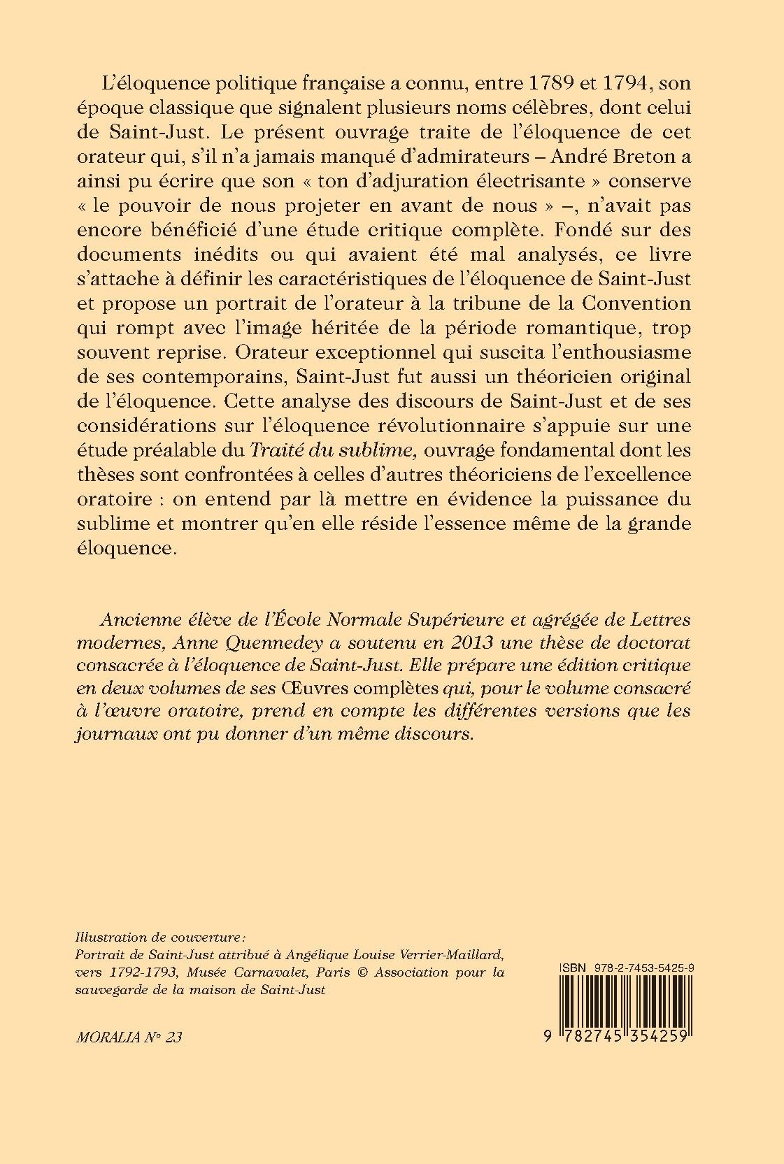 L’éloquence politique française a connu, entre 1789 et 1794, son époque classique que signalent plusieurs noms célèbres, dont celui de Saint-Just. Le présent ouvrage traite de l’éloquence de cet orateur qui, s’il n’a jamais manqué d’admirateurs – André Breton a ainsi pu écrire que son « ton d’adjuration électrisante » conserve « le pouvoir de nous projeter en avant de nous » –, n’avait pas encore bénéficié d’une étude critique complète. Fondé sur des documents inédits ou qui avaient été mal analysés, ce livre s’attache à définir les caractéristiques de l’éloquence de Saint-Just et propose un portrait de l’orateur à la tribune de la Convention qui rompt avec l’image héritée de la période romantique, trop souvent reprise. Orateur exceptionnel qui suscita l’enthousiasme de ses contemporains, Saint-Just fut aussi un théoricien original de l’éloquence. Cette analyse des discours de Saint-Just et de ses considérations sur l’éloquence révolutionnaire s’appuie sur une étude préalable du Traité du sublime, ouvrage fondamental dont les thèses sont confrontées à celles d’autres théoriciens de l’excellence oratoire : on entend par là mettre en évidence la puissance du sublime et montrer qu’en elle réside l’essence même de la grande éloquence.