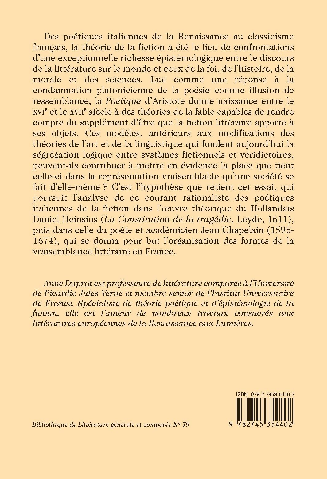 Des poétiques italiennes de la Renaissance au classicisme français, la théorie de la fiction a été le lieu de confrontations d’une exceptionnelle richesse épistémologique entre le discours de la littérature sur le monde et ceux de la foi, de l’histoire, de la morale et des sciences. Lue comme une réponse à la condamnation platonicienne de la poésie comme illusion de ressemblance, la Poétique d’Aristote donne naissance entre le XVIe et le XVIIe siècle à des théories de la fable capables de rendre compte du supplément d’être que la fiction littéraire apporte à ses objets. Ces modèles, antérieurs aux modifications des théories de l’art et de la linguistique qui fondent aujourd’hui la ségrégation logique entre systèmes fictionnels et véridictoires, peuvent-ils contribuer à mettre en évidence la place que tient celle-ci dans la représentation vraisemblable qu’une société se fait d’elle-même ? C’est l’hypothèse que retient cet essai, qui poursuit l’analyse de ce courant rationaliste des poétiques italiennes de la fiction dans l’oeuvre théorique du Hollandais Daniel Heinsius (La Constitution de la tragédie, Leyde, 1611), puis dans celle du poète et académicien Jean Chapelain (1595-1674), qui se donna pour but l’organisation des formes de la vraisemblance littéraire en France.