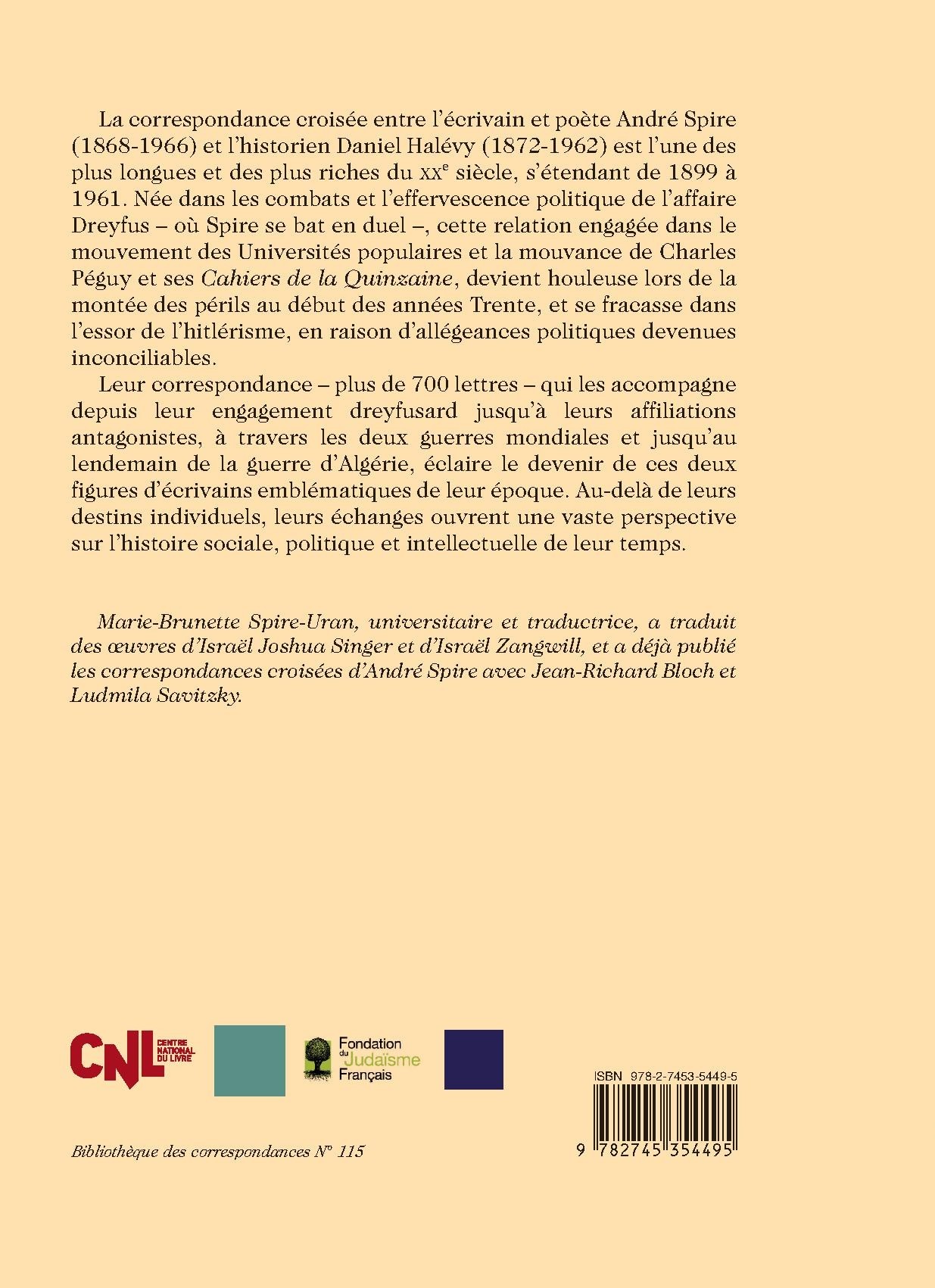 La correspondance croisée entre l’écrivain et poète André Spire (1868-1966) et l’historien Daniel Halévy (1872-1962) est l’une des plus longues et des plus riches du XXe siècle, s’étendant de 1899 à 1961. Née dans les combats et l’effervescence politique de l’affaire Dreyfus – où Spire se bat en duel –, cette relation engagée dans le mouvement des Universités populaires et la mouvance de Charles Péguy et ses Cahiers de la Quinzaine, devient houleuse lors de la montée des périls au début des années Trente, et se fracasse dans l’essor de l’hitlérisme, en raison d’allégeances politiques devenues inconciliables.