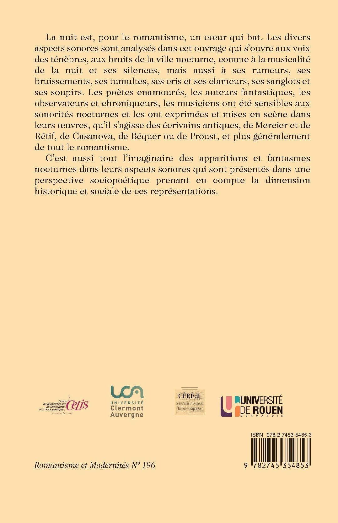 La nuit est, pour le romantisme, un cœur qui bat. Les divers aspects sonores sont analysés dans cet ouvrage qui s’ouvre aux voix des ténèbres, aux bruits de la ville nocturne, comme à la musicalité de la nuit et ses silences, mais aussi à ses rumeurs, ses bruissements, ses tumultes, ses cris et ses clameurs, ses sanglots et ses soupirs. Les poètes enamourés, les auteurs fantastiques, les observateurs et chroniqueurs, les musiciens ont été sensibles aux sonorités nocturnes et les ont exprimées et mises en scène dans leurs œuvres, qu’il s’agisse des écrivains antiques, de Mercier et de Rétif, de Casanova, de Béquer ou de Proust, et plus généralement de tout le romantisme.