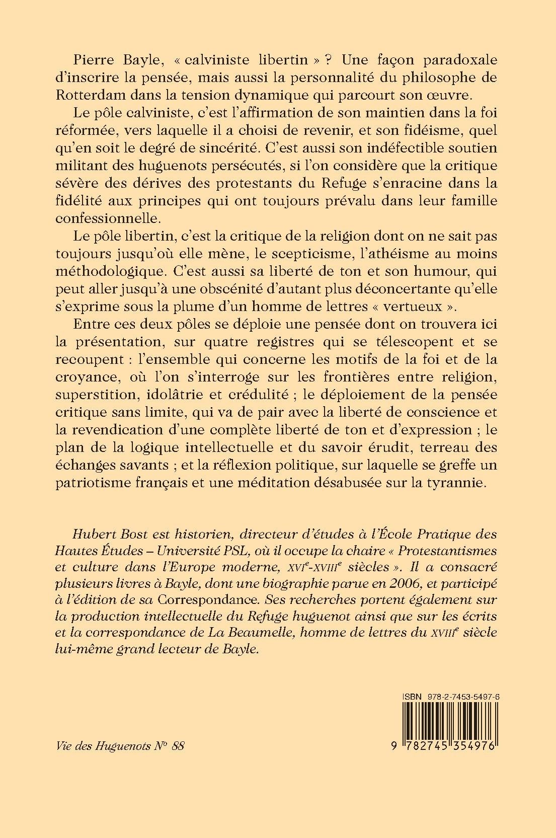 Hubert Bost est historien, directeur d’études à l’École Pratique des Hautes Études – Université PSL, où il occupe la chaire « Protestantismes et culture dans l’Europe moderne, XVIe-XVIIIe siècles ». Il a consacré plusieurs livres à Bayle, dont une biographie parue en 2006, et participé à l’édition de sa Correspondance. Ses recherches portent également sur la production intellectuelle du Refuge huguenot ainsi que sur les écrits et la correspondance de La Beaumelle, homme de lettres du XVIIIe siècle lui-même grand lecteur de Bayle.
