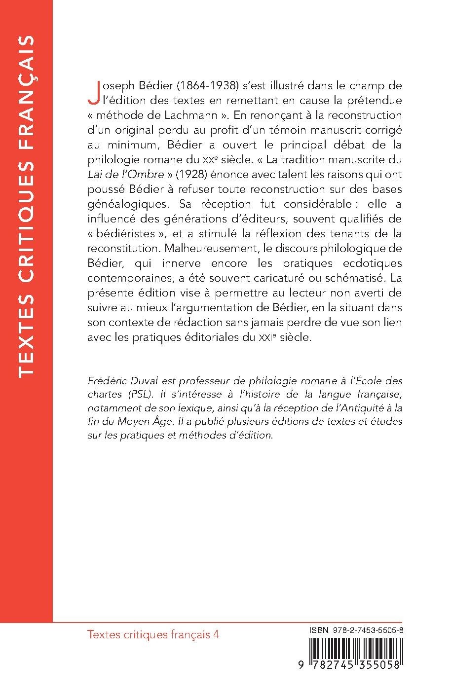 Joseph Bédier (1864-1938) s’est illustré dans le champ de l’édition des textes en remettant en cause la prétendue « méthode de Lachmann ». En renonçant à la reconstruction d’un original perdu au profit d’un témoin manuscrit corrigé au minimum, Bédier a ouvert le principal débat de la philologie romane du XXe siècle. « La tradition manuscrite du Lai de l’Ombre » (1928) énonce avec talent les raisons qui ont poussé Bédier à refuser toute reconstruction sur des bases généalogiques. Sa réception fut considérable : elle a influencé des générations d’éditeurs, souvent qualifiés de « bédiéristes », et a stimulé la réflexion des tenants de la reconstitution. Malheureusement, le discours philologique de Bédier, qui innerve encore les pratiques ecdotiques contemporaines, a été souvent caricaturé ou schématisé. La présente édition vise à permettre au lecteur non averti de suivre au mieux l’argumentation de Bédier, en la situant dans son contexte de rédaction sans jamais perdre de vue son lien avec les pratiques éditoriales du XXIe siècle.