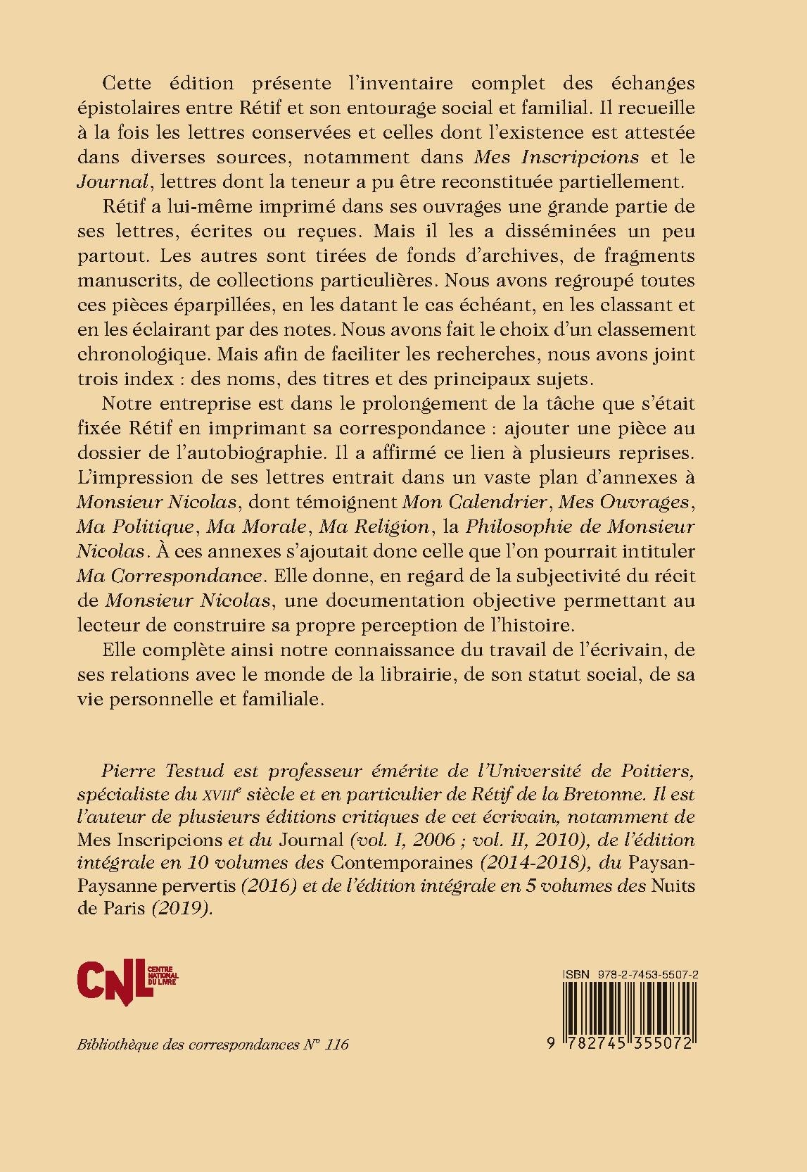 Cette édition présente l’inventaire complet des échanges épistolaires entre Rétif et son entourage social et familial. Il recueille à la fois les lettres conservées et celles dont l’existence est attestée dans diverses sources, notamment dans Mes Inscripcions et le Journal, lettres dont la teneur a pu être reconstituée partiellement.