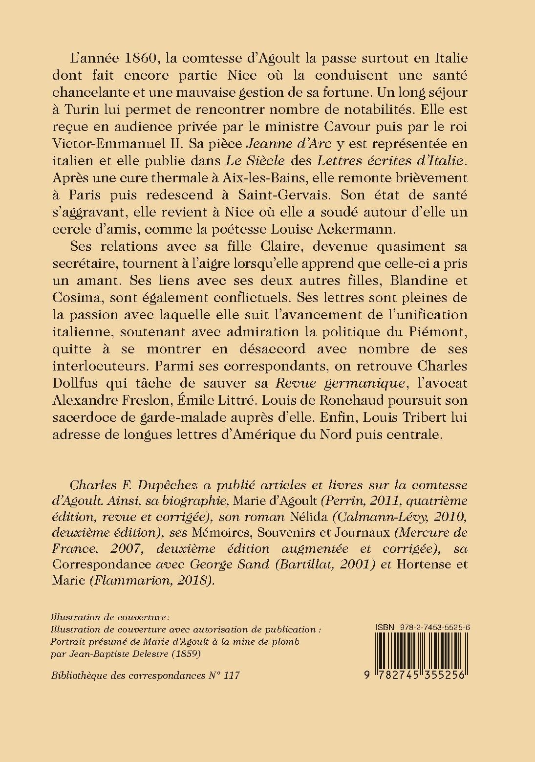 L’année 1860, la comtesse d’Agoult la passe surtout en Italie dont fait encore partie Nice où la conduisent une santé chancelante et une mauvaise gestion de sa fortune. Un long séjour à Turin lui permet de rencontrer nombre de notabilités. Elle est reçue en audience privée par le ministre Cavour puis par le roi Victor-Emmanuel II. Sa pièce Jeanne d’Arc y est représentée en italien et elle publie dans Le Siècle des Lettres écrites d’Italie. Après une cure thermale à Aix-les-Bains, elle remonte brièvement à Paris puis redescend à Saint-Gervais. Son état de santé s’aggravant, elle revient à Nice où elle a soudé autour d’elle un cercle d’amis, comme la poétesse Louise Ackermann.
