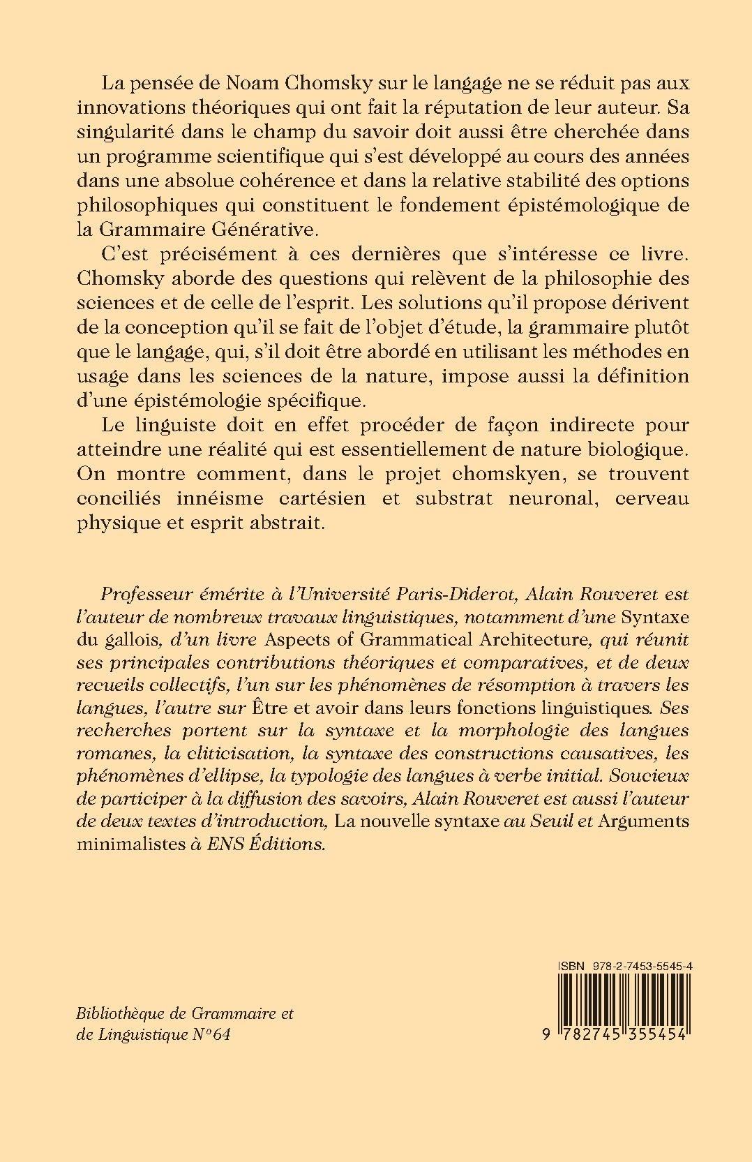La pensée de Noam Chomsky sur le langage ne se réduit pas aux innovations théoriques qui ont fait la réputation de leur auteur. Sa singularité dans le champ du savoir doit aussi être cherchée dans un programme scientifique qui s’est développé au cours des années dans une absolue cohérence et dans la relative stabilité des options philosophiques qui constituent le fondement épistémologique de la Grammaire Générative.
