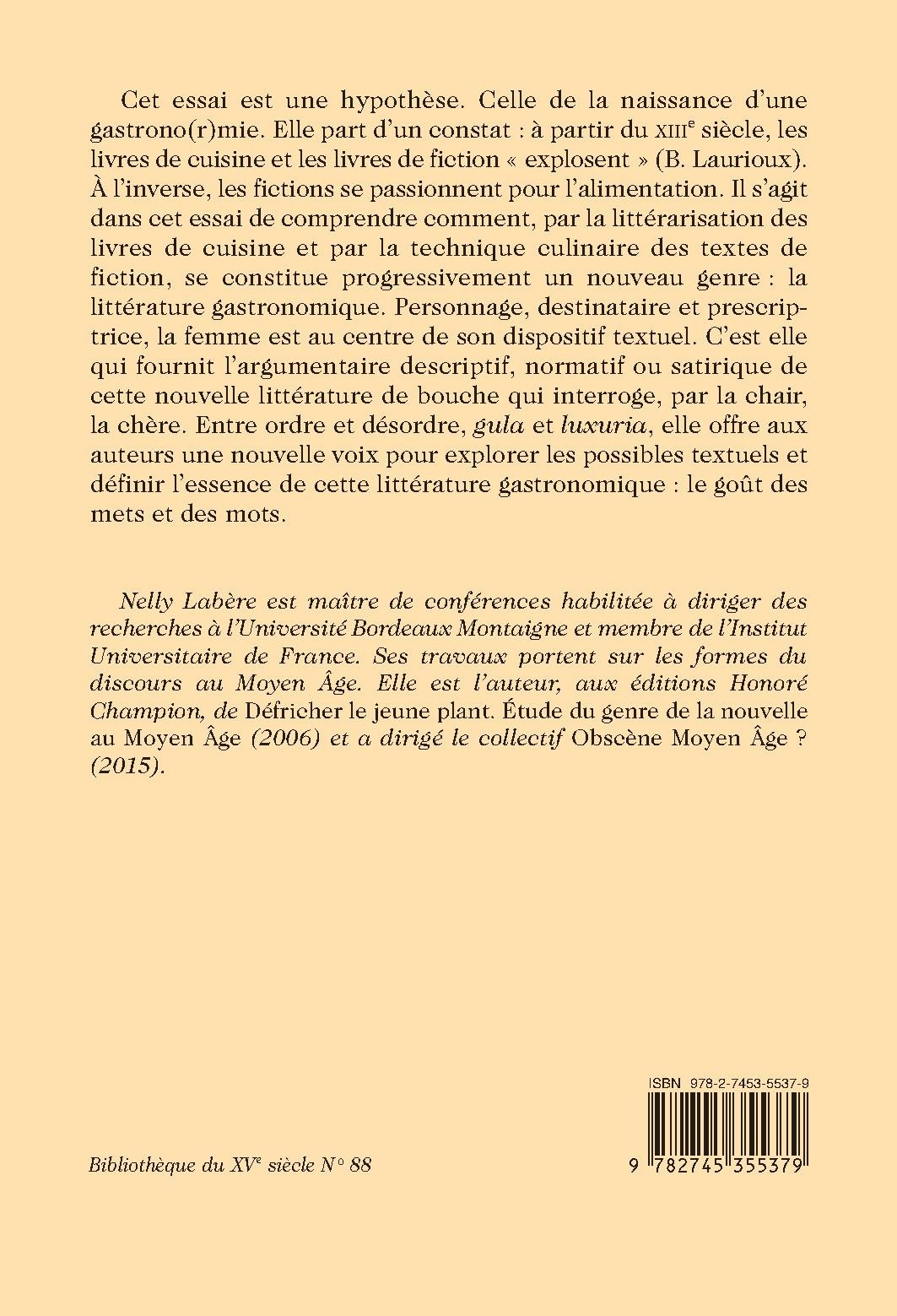 Cet essai est une hypothèse. Celle de la naissance d’une gastrono(r)mie. Elle part d’un constat : à partir du XIIIe siècle, les livres de cuisine et les livres de fiction « explosent » (B. Laurioux). À l’inverse, les fictions se passionnent pour l’alimentation. Il s’agit dans cet essai de comprendre comment, par la littérarisation des livres de cuisine et par la technique culinaire des textes de fiction, se constitue progressivement un nouveau genre : la littérature gastronomique. Personnage, destinataire et prescriptrice, la femme est au centre de son dispositif textuel. C’est elle qui fournit l’argumentaire descriptif, normatif ou satirique de cette nouvelle littérature de bouche qui interroge, par la chair, la chère. Entre ordre et désordre, gula et luxuria, elle offre aux auteurs une nouvelle voix pour explorer les possibles textuels et définir l’essence de cette littérature gastronomique : le goût des mets et des mots.